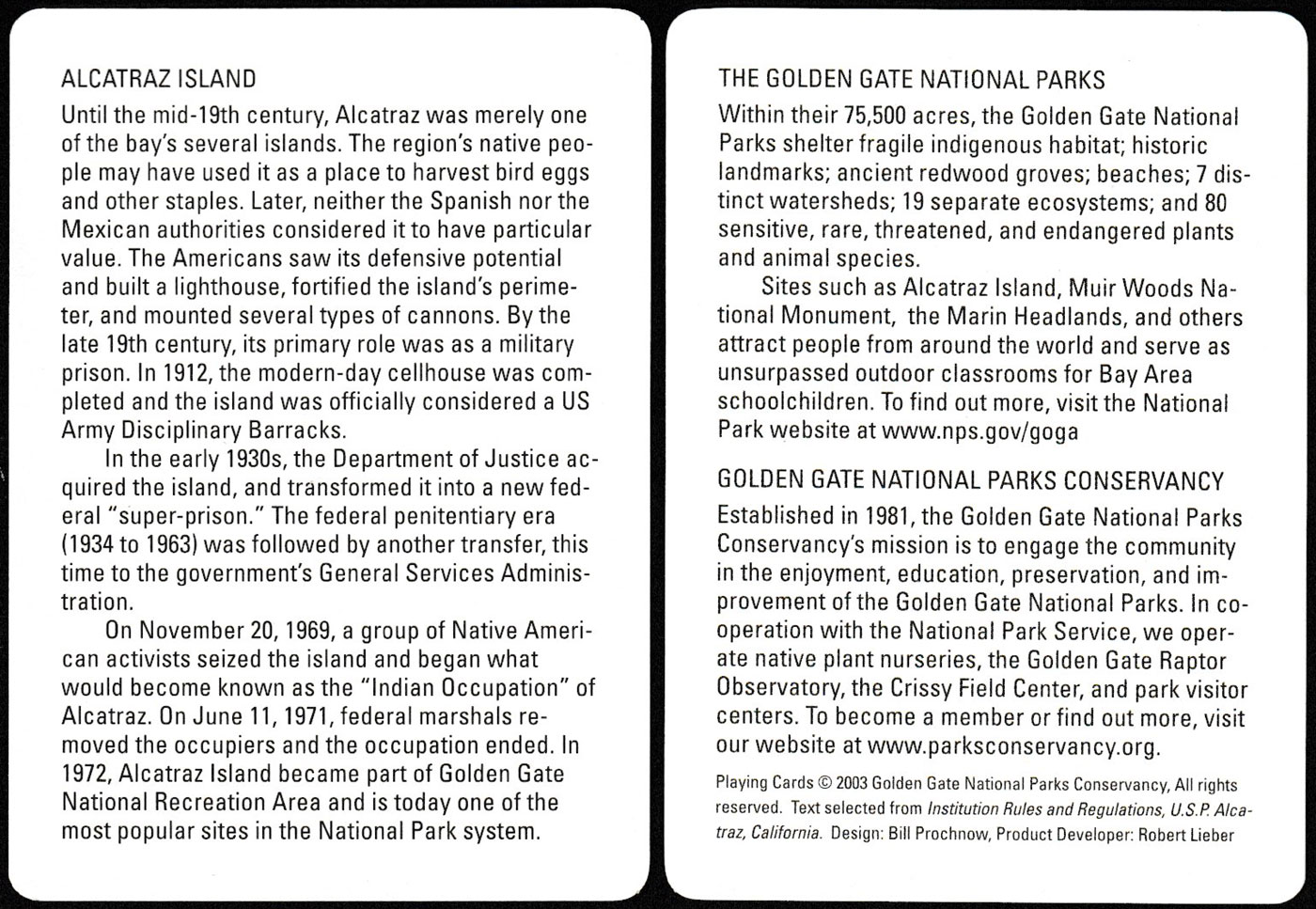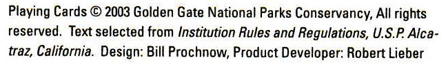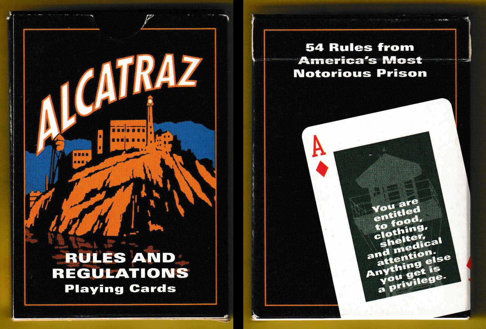 Above: Alcatraz: Rules and Regulations Playing Cards. Printed by Piatnik for the Golden Gate National Parks Conservancy, CA, USA, 2003. 52 cards + 2 Jokers + 1 extra card with text in tuck box. Size 63 x 88 mm.