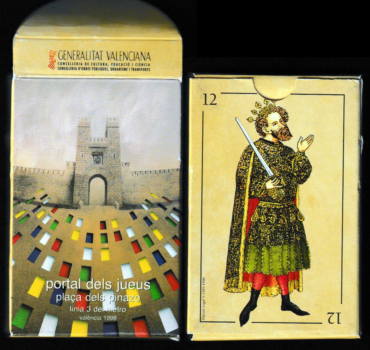 Valencia is certainly proud of its history, its traditions and its fiestas but it does seem odd to depict figures in medieval costume on a pack celebrating the opening of a new metro line! The figures themselves are not named. Buff-coloured backgrounds. One unusual feature is that there are no line breaks to indicate the different suits; however, there are occasional breaks where a design spills over into the border. The only cards with any text are the Ace and 4 of Coins. The pack appears to have been sponsored by the Transport Department of the local government (Generalitat Valenciana) as their name appears on the end flaps of the box►