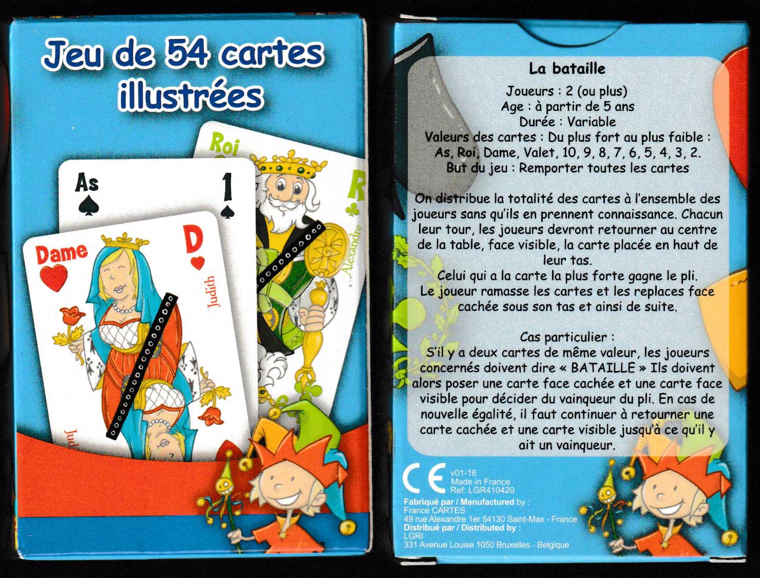 Illustrator Nicolas Bernard has attempted to modernise and rejuvenate the faces of standard French court cards to make them more attractive to children. The names/values of all the cards are spelt out in full alongside the traditional indices – in French at one end of each card, in English at the other. In addition, this is a 4-colour pack: S = black; H = red; C = green; D = yellow. The Joker is a childlike jester. Blue patterned backs. The rules for playing La bataille are printed in French on the reverse of the tuck box. See the box►