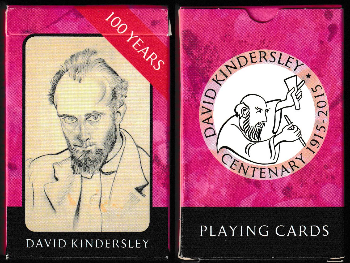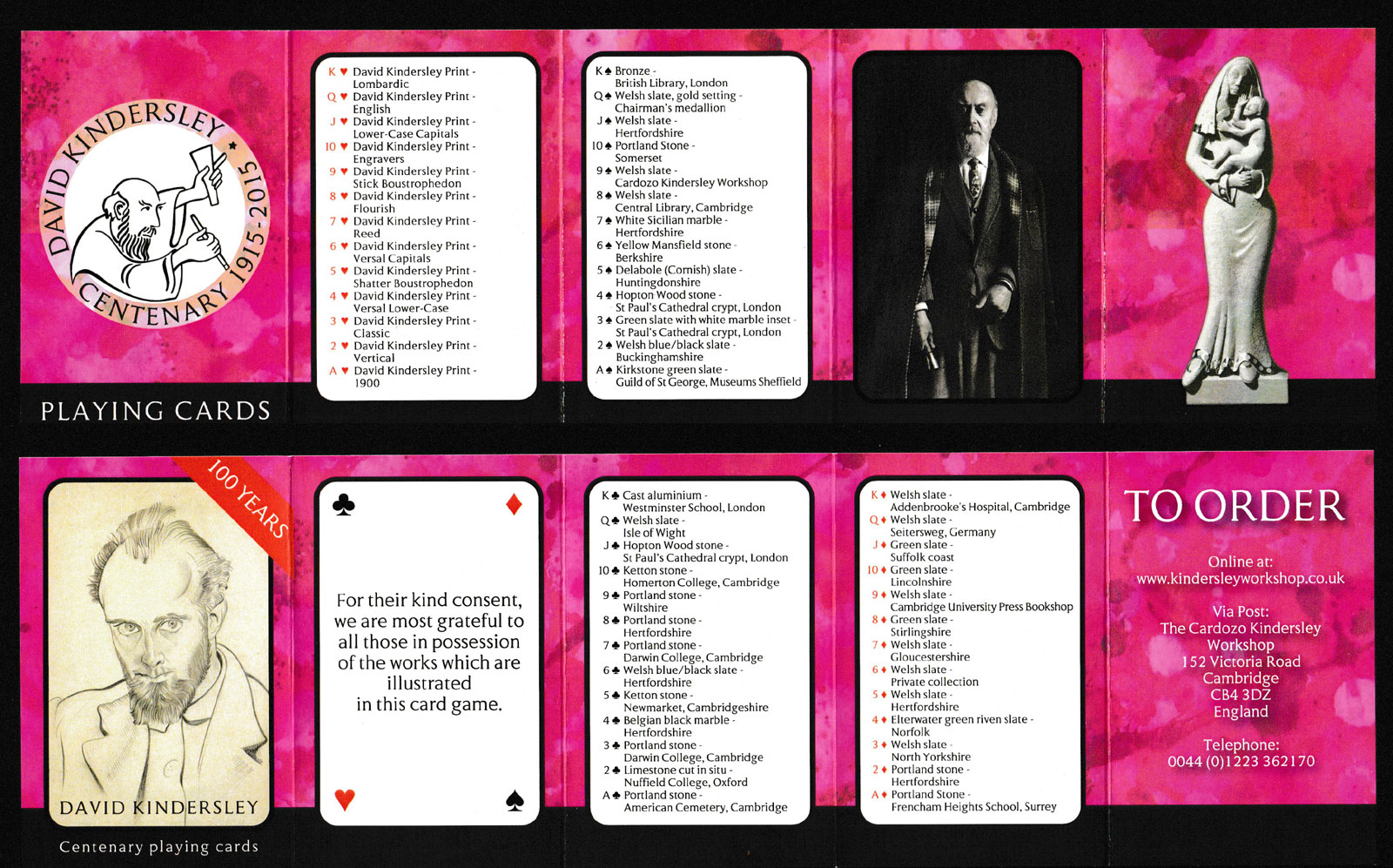 Above: David Kindersley centenary playing cards published by the Cardozo Kindersley Workshop, Cambridge, UK, 2015. 52 cards + 2 Jokers + 2 extra cards (each with a different back design from the rest of the pack) + fold-out leaflet in tuck box. Size: 56 x 87 mm. Maker unknown.