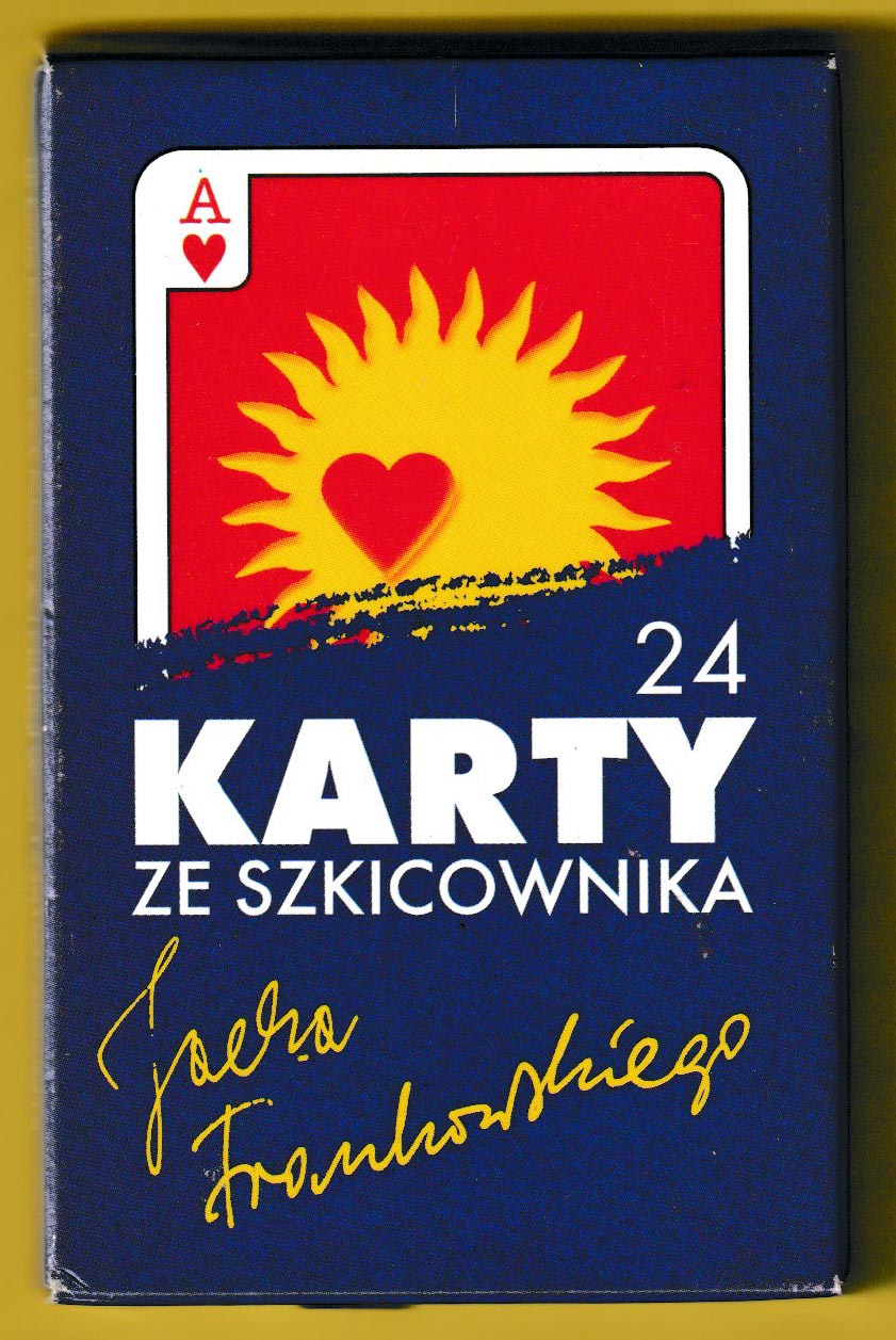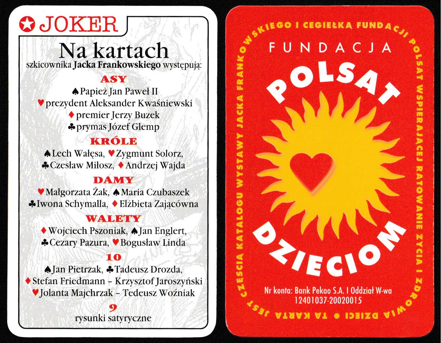 Caricatures in full colour of contemporary Poles from the sketchbook of Jacka Frankowskiego on all the court cards, Aces and 10s. Satirical drawings on the 9s. The names of all the characters depicted are listed on the Joker. These include Pope John Paul II (AS), President Aleksander Kwaśniewski (AH), Prime Minister Jerzy Buzek (AD), Cardinal Józef Glemp (AC), and Lech Walęsa (KS). Indices K, D, J, A. Backs: the charity’s logo and other text in red, yellow and white. See the box►