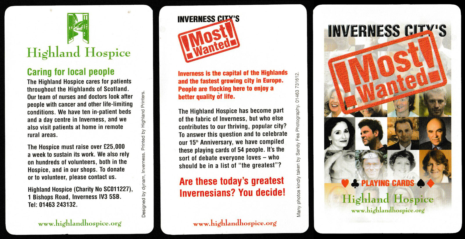 Above: Highland Hospice playing cards published by the Highland Hospice, Inverness, c.2002. 52 cards + 2 Jokers + 2 extra cards. Size: 56 x 87 mm. Printed by Highland Printers.