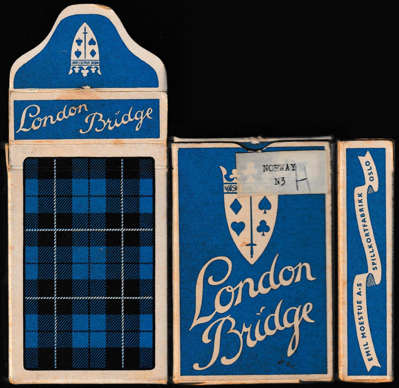 The earlier edition, in a slightly thicker box than the later one, carries the text “EMIL MOESTUE A-S / SPILLKORTFABRIKK / OSLO” so was perhaps made in Oslo. The courts are of the standard Goodall/De La Rue type. The Ace of Spades bears a Norwegian tax stamp from the 1960s. There is a mock tartan back design (possibly alluding to Scotland?) with a very pale blue border. Note too the scalloped flap of the box. 52 cards + 2 Jokers + 1 bridge score card + 1 blank card in tuck box. See the box►