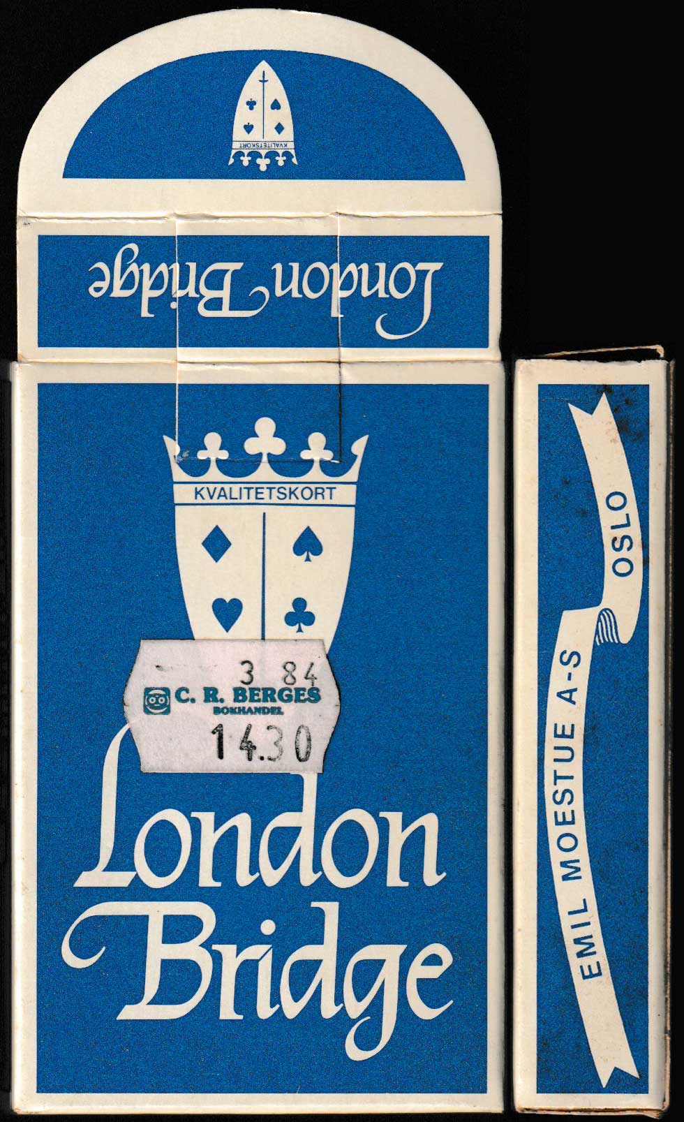 Over the years, two different standard English pattern packs, with the same back design and the same brand name but with different court card designs and slightly different boxes, were published by Emil Moestue, Oslo.