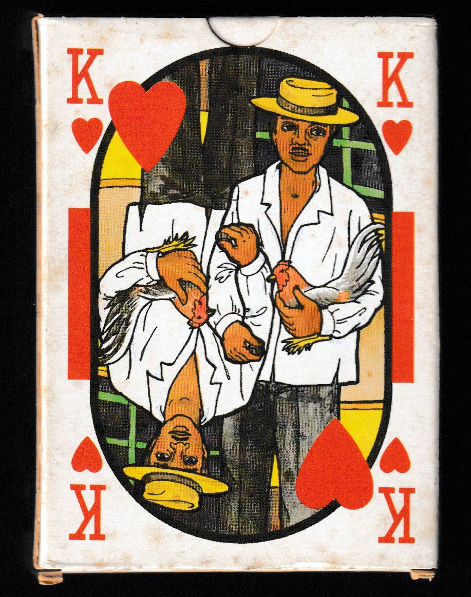 Bold, bright, colourful designs by local artist Martine Porry (b. 1954) reflecting the sunny side of the French island of Martinique. Double-ended courts featuring local people at work and at play against backdrops of the countryside or the sea. The natural world is featured on the Aces. The pip cards are undecorated. The Jokers show a jester and a local dancer. Overall there is a strong unity of colour. A map of the group of islands known as the Antilles in the Caribbean Sea is depicted on the reverse.