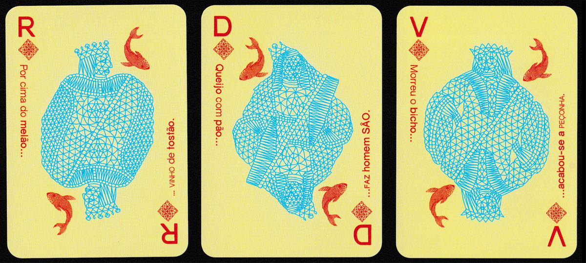 Clearly a lot of thought, imagination and ingenuity has gone into the creation of this pack. For the design work and choice of proverbs we have to thank Natali Nascimento. The work was done as a project for part of a master's degree in 2011 and it was finally published in 2016. The proverbs have been arranged by theme – health, climate and agriculture, love, and justice – one on each suit. These themes are further represented by non-standard pips – blue fish for health, pink birds for climate and agriculture, purple flowers for love, and green leaves for justice. The court cards are loosely based on traditional ones (French pattern?) but generated using computer graphics. The suit-signs in the corners and the four Jokers have been created using the same technique. Indices R, D, V, A. Cream backgrounds. The extensive leaflet in Portuguese explains how the proverbs have been arranged, including ones connected with fortune on the Jokers. All in all, unusual and strangely attractive. See the box