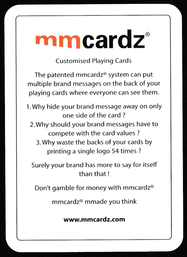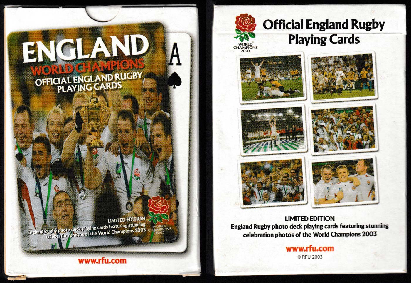 Above: the backs of the cards celebrating the rugby world champions of 2003. Produced by MMcardz, 52 cards + 2 Jokers + 2 extra cards in tuck box. Poker size.