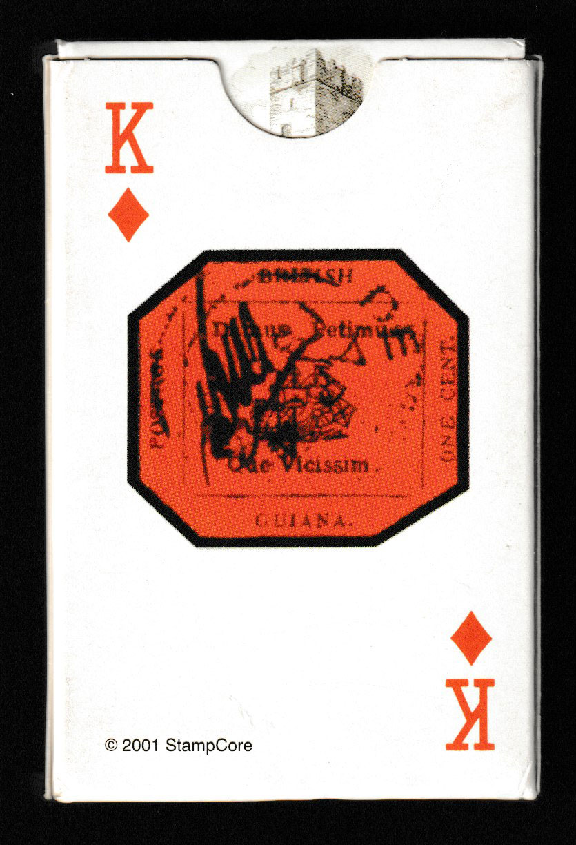 The idea behind this pack was to inform and encourage collectors to explore the world of rare stamps. All the most obvious rarities are depicted, including two stamps with inverted centres on the Jokers. Most of the images are in a vertical format. The famous British Guiana 1c stamp of 1856 is shown on the King of Diamonds. This stamp is currently owned by Stanley Gibbons, London stamp dealers, who occasionally display it at their premises in the Strand. From the feel of the cards and the look of the box, this pack was probably printed in the USA or Canada. The box carries the legend “Collector Series #1”. See the box►