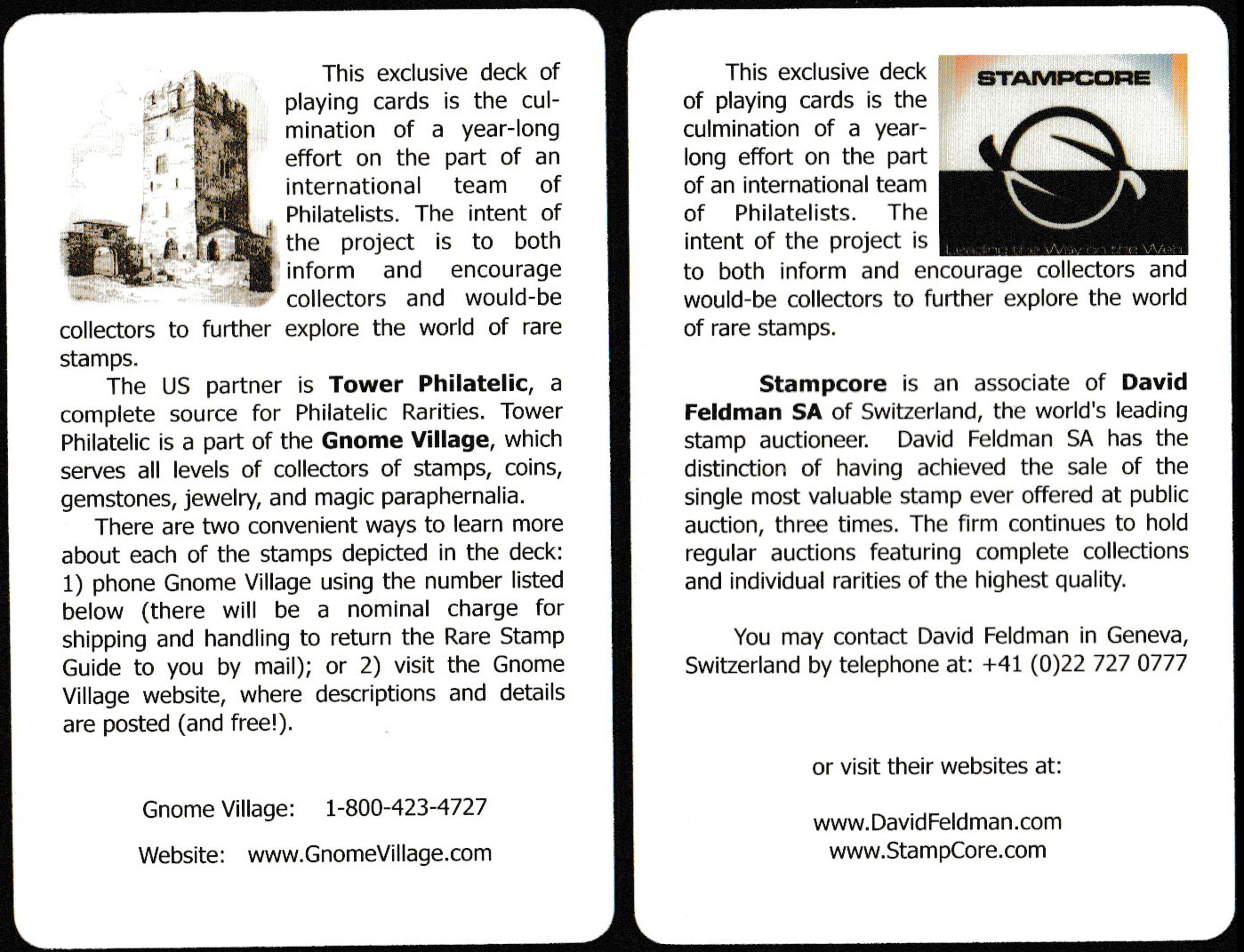 Above: Rare stamps of the World playing cards published jointly by David Feldman SA of Switzerland and Tower Philatelic, USA, 2001. 52 cards + 2 Jokers + 2 extra cards in a tuck box. Bridge size.