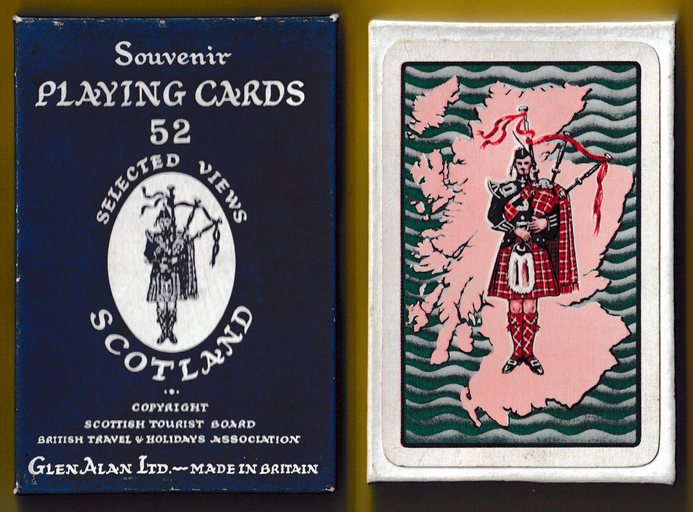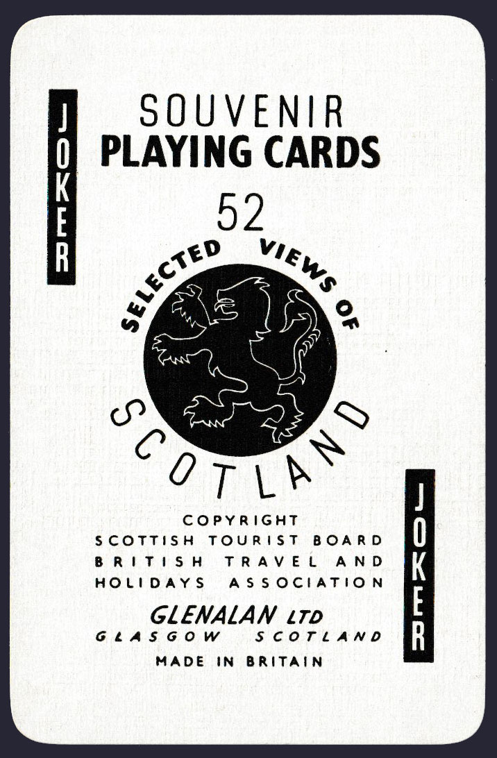 Above: 52 selected views of Scotland by De La Rue (Waddingtons) for GlenAlan Ltd, Glasgow, Scotland, c.1960s. 52 cards + 2 Jokers in drop-lid box. Size: 58 x 89 mm.