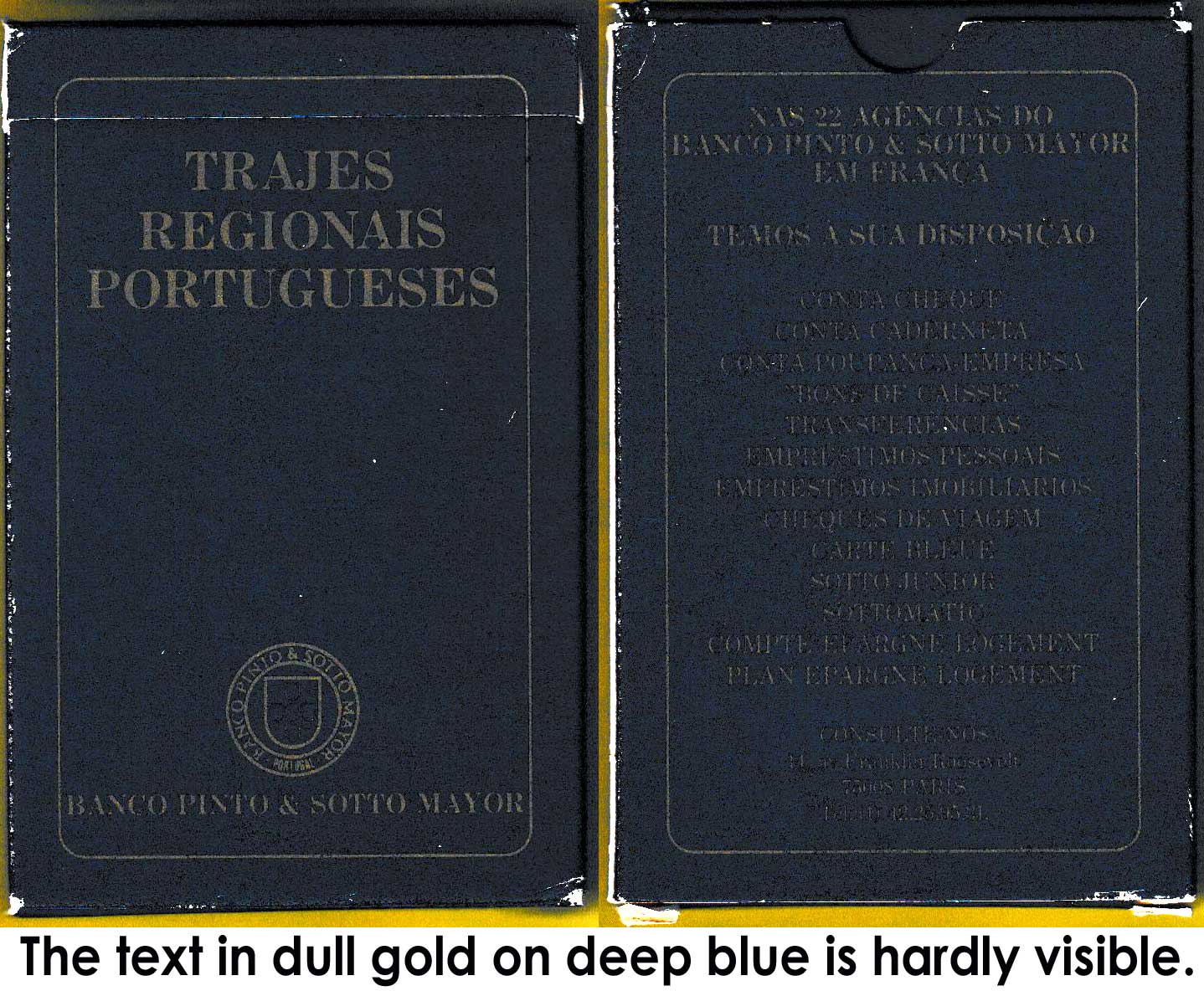 Note: the text on the reverse of the cards and the box is in dull gold on deep blue and hardly visible. The back design shows the logo of the bank 24 times and the name of the bank twice.