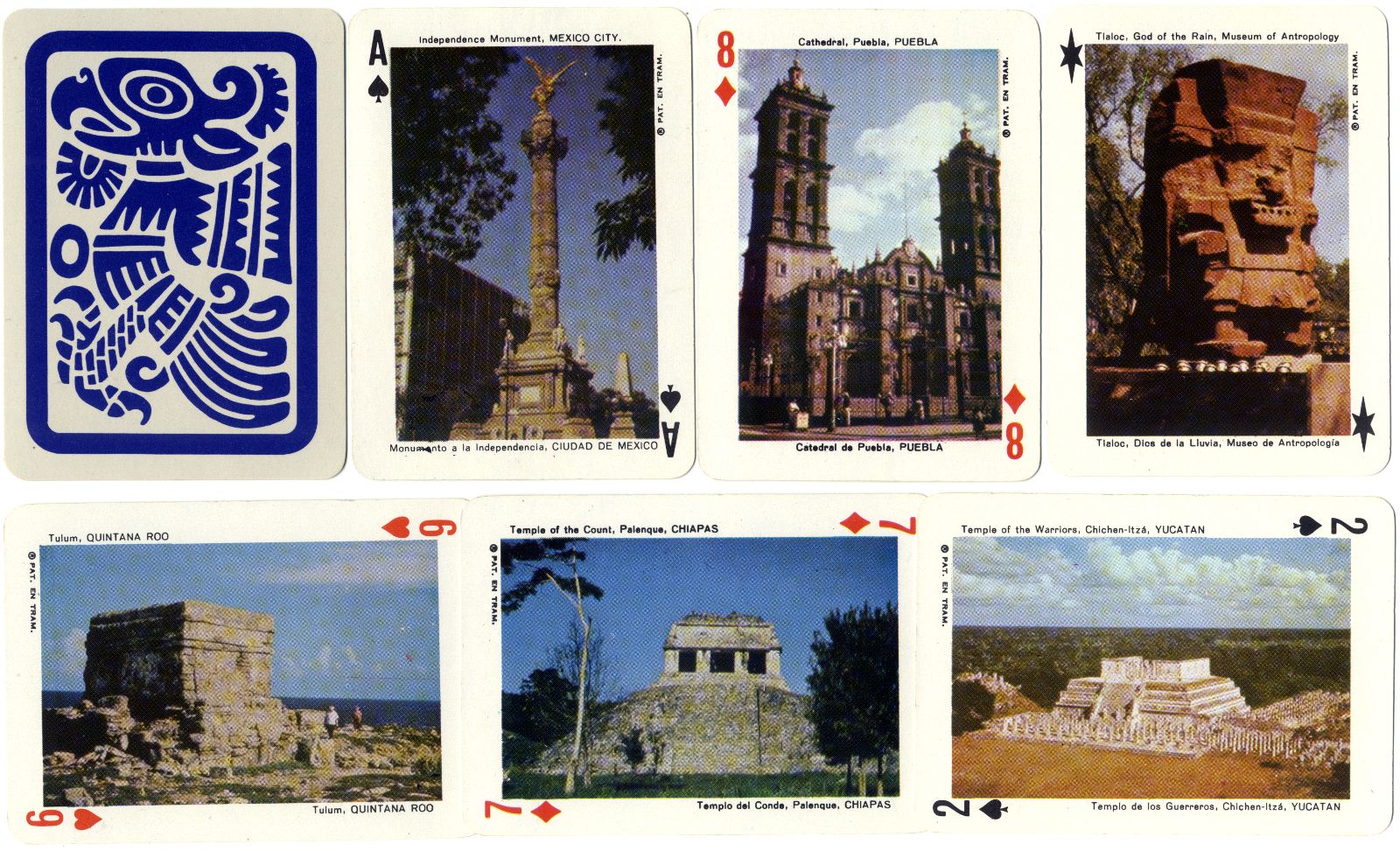 Above: Mexican Panoramic Playing Cards by an anonymous manufacturer (Click image to see more cards). Designed for the tourist market, the pack includes a tourist map of Mexico and a guide to the beauties of Mexico and its ancient cultures. The captions on the cards are bi-lingual Spanish-English. Plastic coated cards, 52 cards + 2 Jokers in box + map.