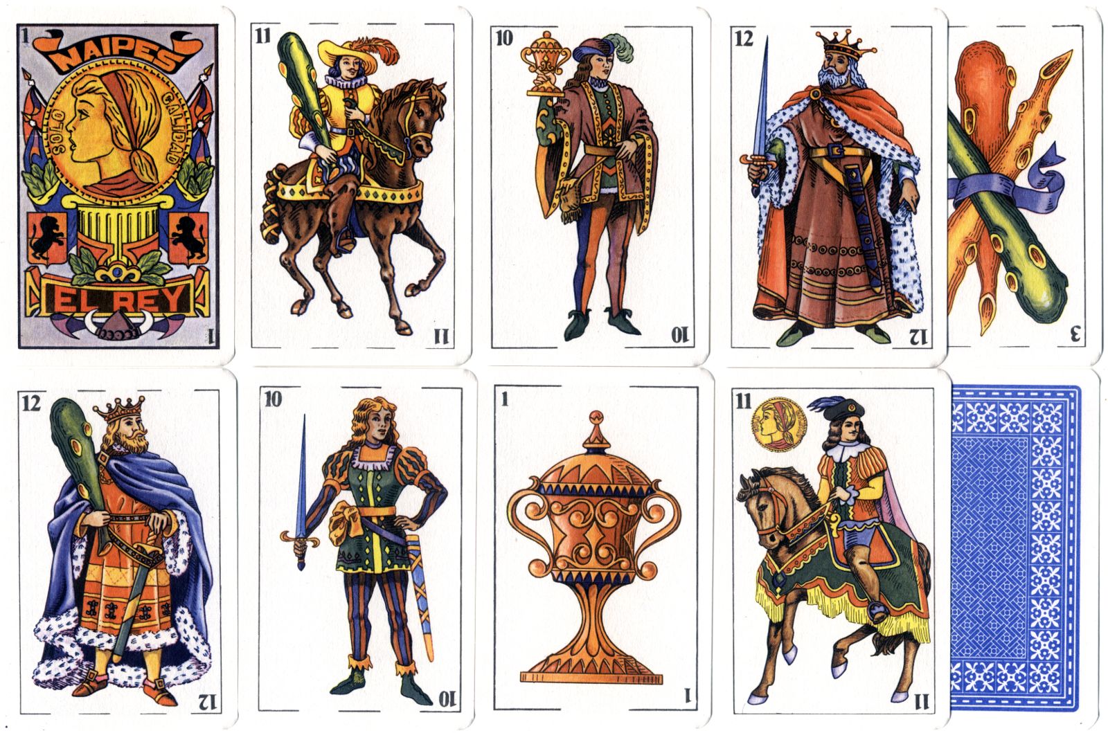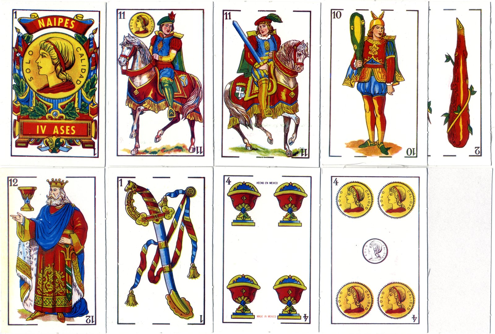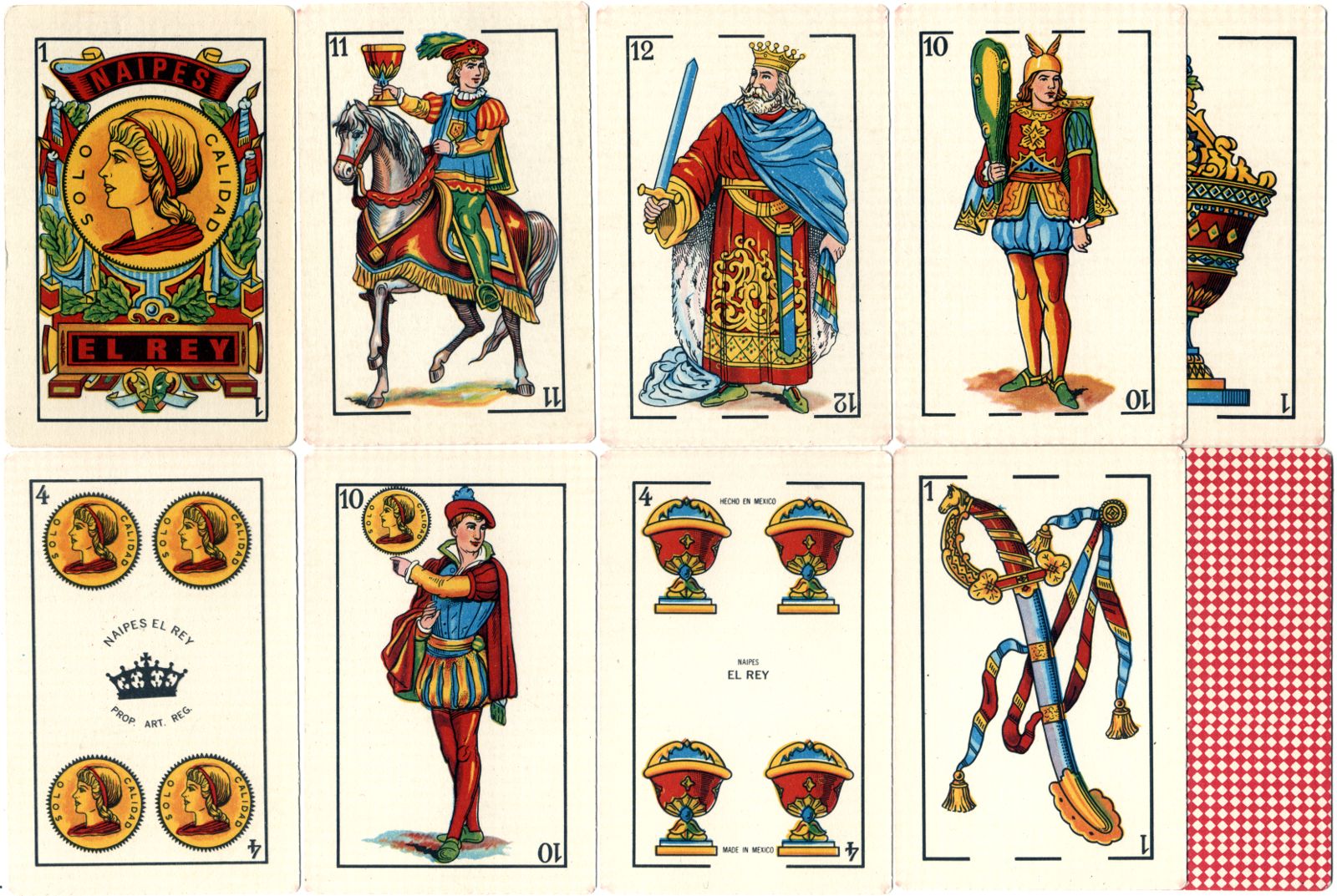 Above: Naipes El Rey by an anonymous manufacturer (possibly Migasa), c.1985. 40 cards, printed on low grade cardboard with nearly square corners. The designs are copied from Fournier's 'Castilian' pattern, as are a large number of Mexican decks. All the Coins suit symbols have the legend Solo Calidad. The Fours of Coins and Cups have the legends Naipes El Rey and Made in Mexico.