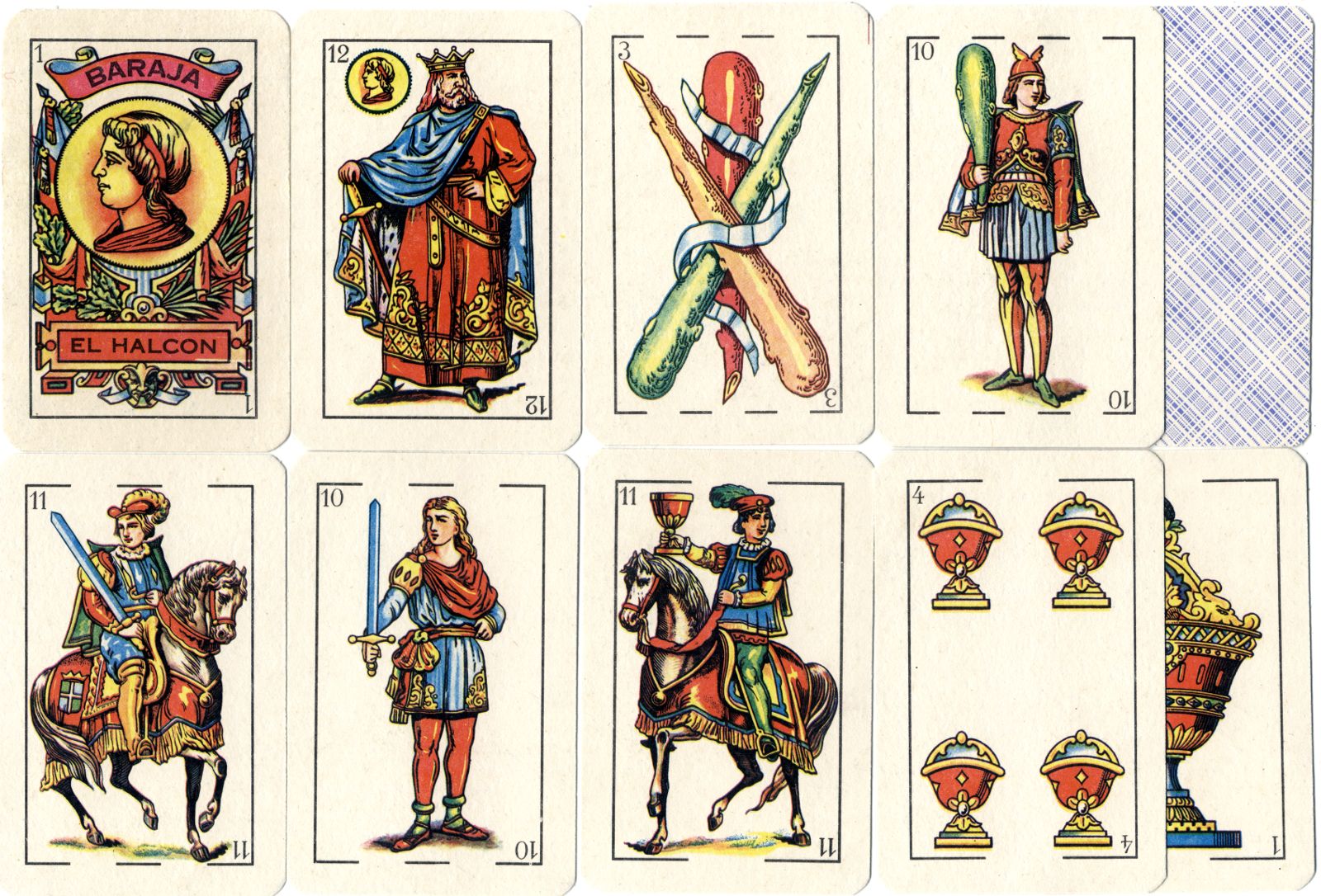 Above: Baraja El Halcon by an anonymous manufacturer, c.2000. (Click image to see more cards). The designs are copied from Fournier's 'Castilian' pattern. There had been an earlier edition of Baraja El Halcon with more imaginative designs. There are no further details of the manufacturer printed on the cards.