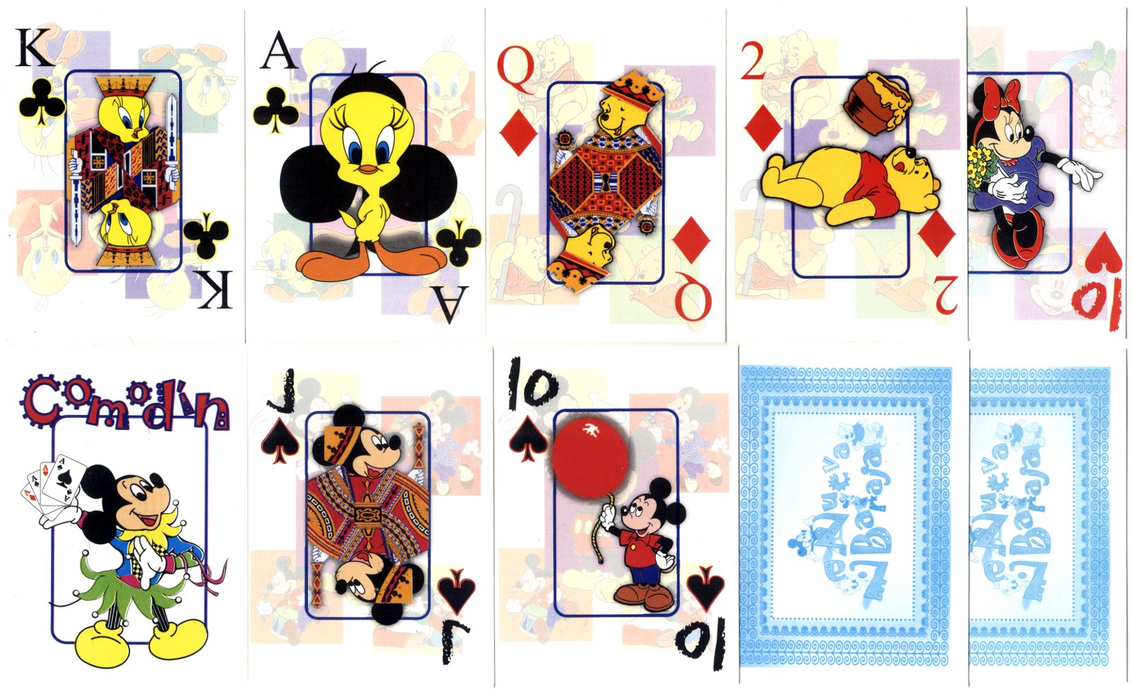 Above: Anon Mexican children's Walt Disney playing cards featuring double-ended Disney characters on the court cards, and single-ended cartoon figures on the number cards. A slight design error can be seen in the corner indices where a different typeface has been used for the Hearts and Spades suits (Click image to see more cards).