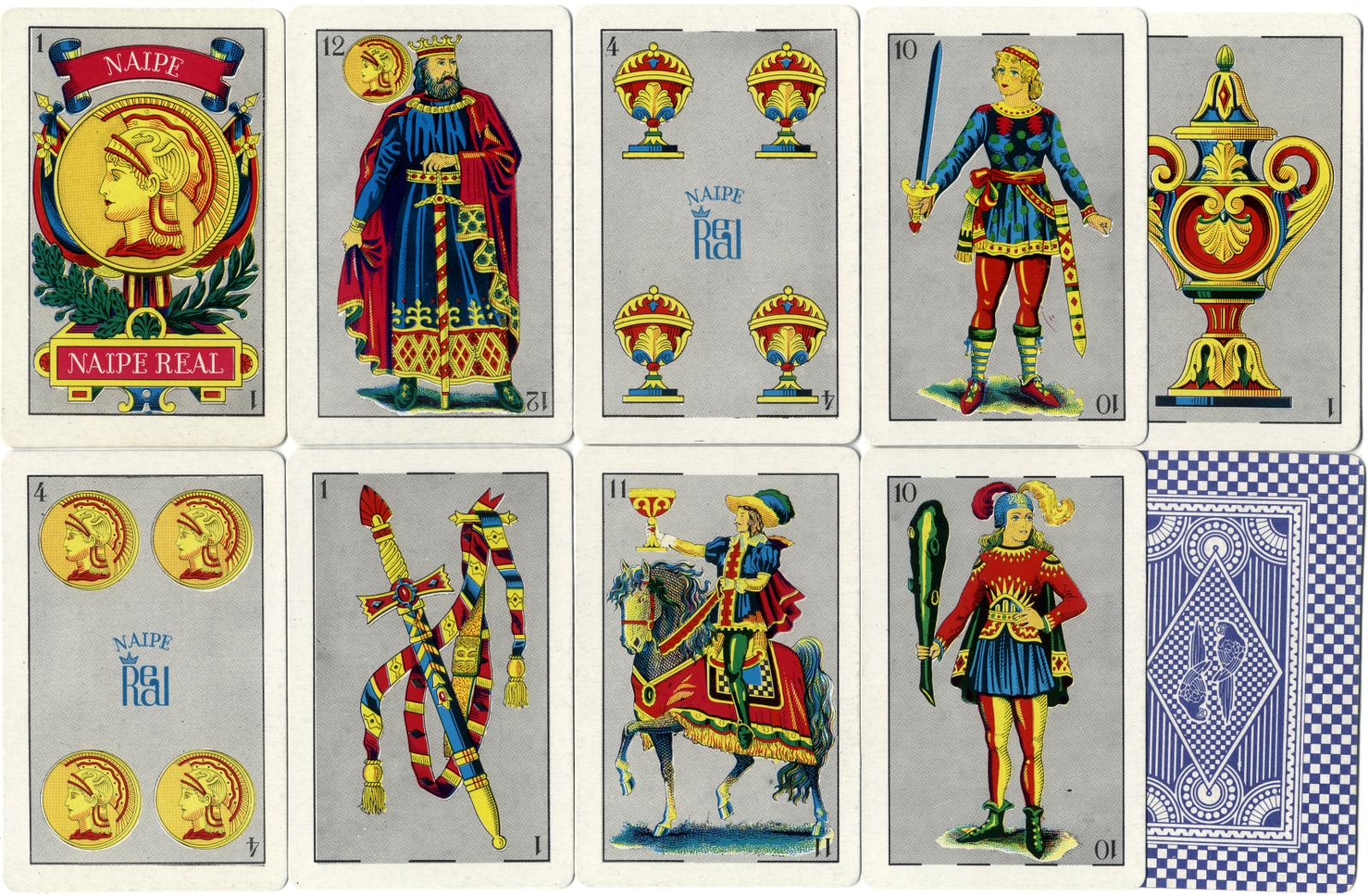 Above: 'Naipe Real' by an anonymous Mexican manufacturer, 40 cards, c.1985. The designs are reminiscent of Clemente Jacques 'Gallo'. The helmet on the medallion on the Ace of Coins has a swan motif as part of the design. There had been an alternative edition of this pack with the name Naipe IV Reyes in the 1980s with yellow backgrounds instead of grey. Apart from the 'Naipe Real' logo on the Fours of Coins and Cups, there are no further details of the manufacturer printed anywhere on the cards.