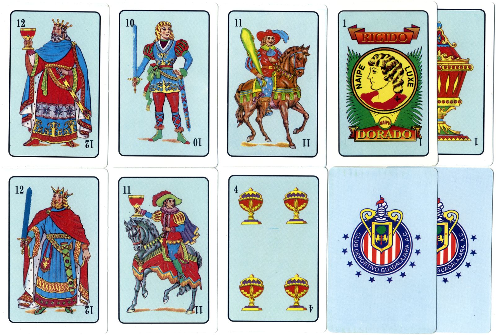 Above: standard 'Castilian'-style Spanish-suited playing cards produced by an anonymous manufacturer for Club Deportivo Guadalajara, A.C. The designs appear to be copied from those of Productos Leo S.A. but there is no mention on any card where or by whom the cards were produced. The designs are more or less copied from Clemente Jacques 'Gallo' and deck is of acceptable overall quality. The Ace of Coins has the legends 'Rigido Naipe Dorado' and 'Naipe Luxe'.