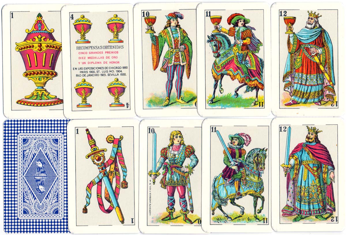 Above: Gallo Intransparente by Clemente Jacques y Cia, S.A., c.1950. The Ace of Coins has no legend at the bottom, but the Sotas (Knaves) of Coins and Swords have the manufacturer's name printed down the edge.