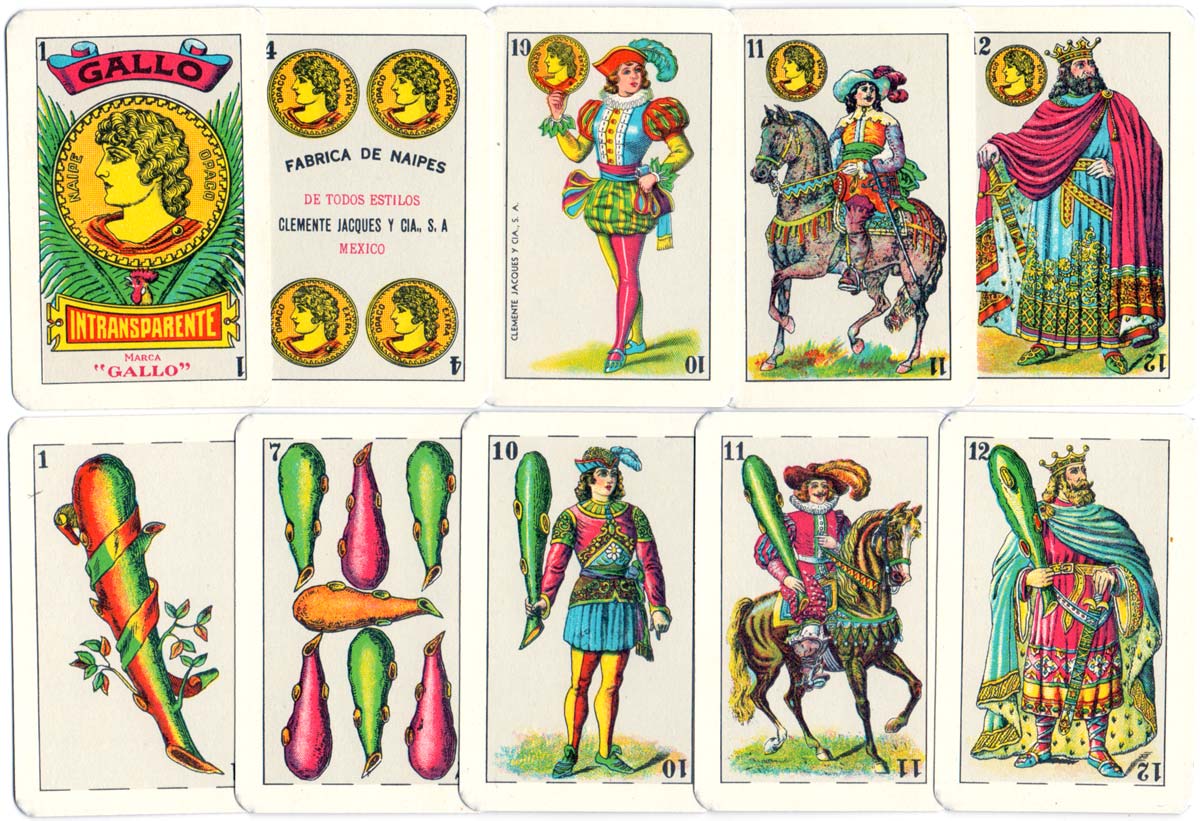 Gallo Intransparente - registered in 1923 - is Clemente Jacques flagship deck of cards. Probably inspired by Fournier's Castilian designs of the late nineteenth century, the Mexican version has a more elaborate design and a moderner period style. After an initial period of closer resemblance to the Spanish medieval designs, the Mexican version emerged and has remained constant over the years; only the legends on some cards vary. Indeed, the Gallo designs have become a sort of standard Mexican pattern, imitated by other Mexican manufacturers such as Pronaco and Productos Leo►