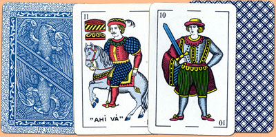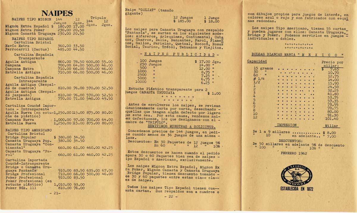 LA CUBANA were successors to P. Munguia, who were founded in 1872. This information is usually stated on the four of coins or cups. The date of transfer of the name is believed to be around 1940. Also, the trade mark "El Aguila" often appears on the ace of coins. The price list inside their 1962 catalogue gives all the various types of playing cards produced at that time, as shown in the list of links above, as well as other speciality items such as chocolates, paper bags and lithographic printing services. It can be seen that La Cubana produced several versions of the Spanish Cadiz style amongst their range. Other brands not included in this catalogue are: El Águila Nueva (new design), El Turco, Naipes Mignon (earlier versions), the later standard English packs and several Jumbo Index editions (Numerus Magnus). Packs of seconds (slightly damaged cards) were also sold, called Tripulo.