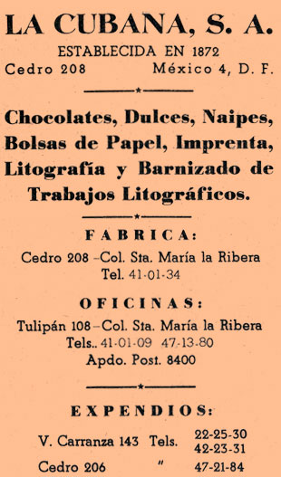 Various addresses are given for the factory, the administration offices and other sales outlets (above left) which over the years also appeared on the cards and wrappers giving the impression that the business kept changing address. At some more recent date the company name changed to La Cubana, S. A. de C.V. and the factory address changed to: Nogal No.187, along with new fax numbers. The company finally closed down in 1995 thus bringing to a close Mexico's longest standing playing-card factory.