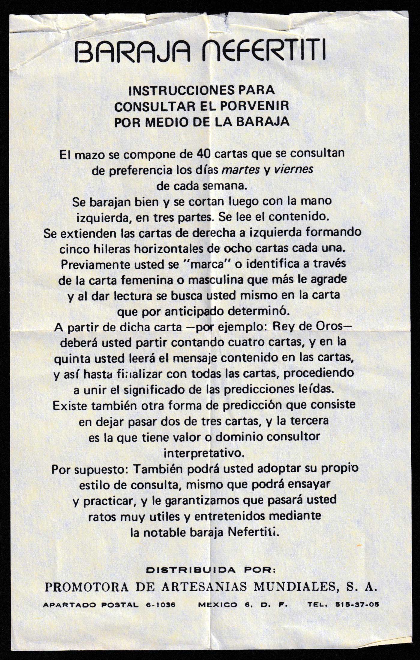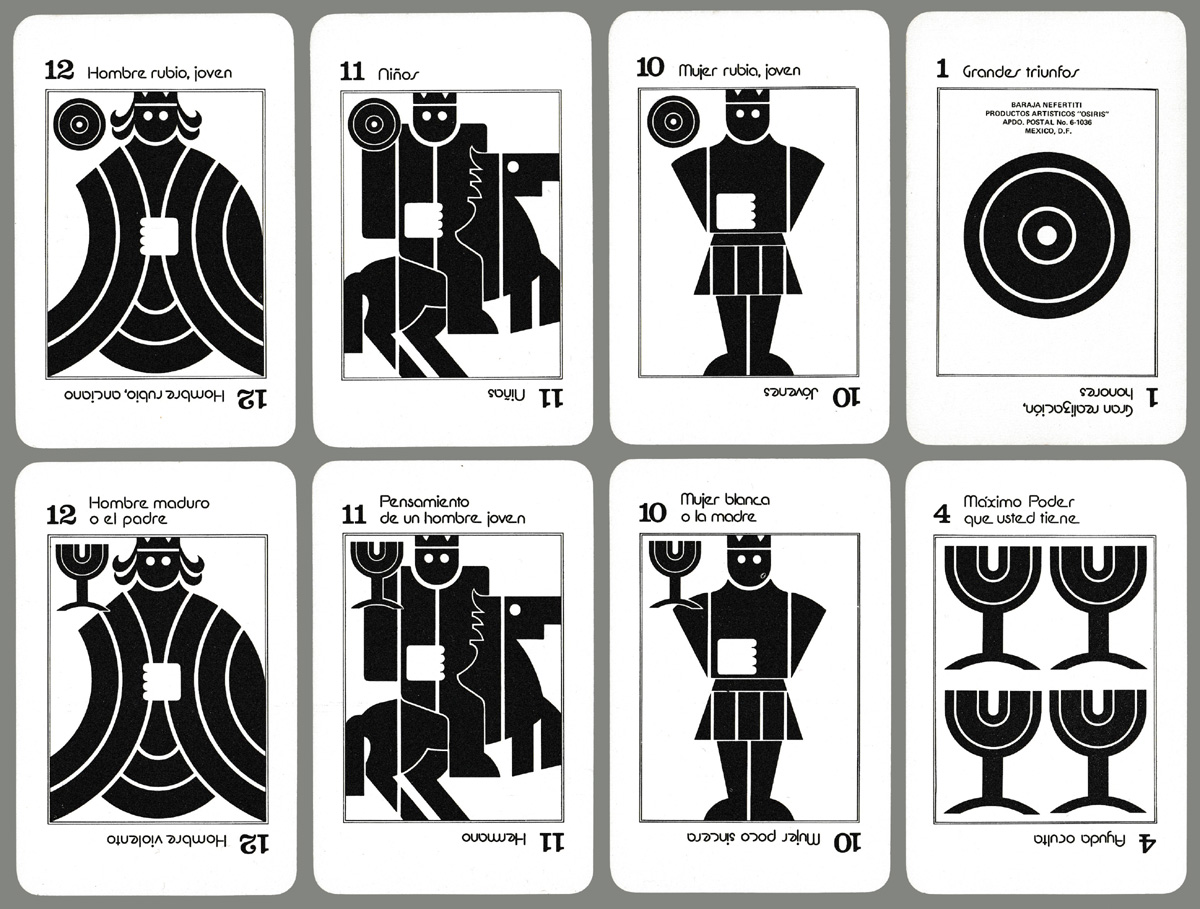 Above: Baraja Nefertiti produced by Productos Artisticos “Osiris” and distributed by Promotora de Artesanias Mundiales, S.A., Mexico, c1975. 40 cards + instruction sheet in Spanish, in tuck box. Size: 62 x 96 mm. The King of Swords is reproduced on the back of the box. See the box►