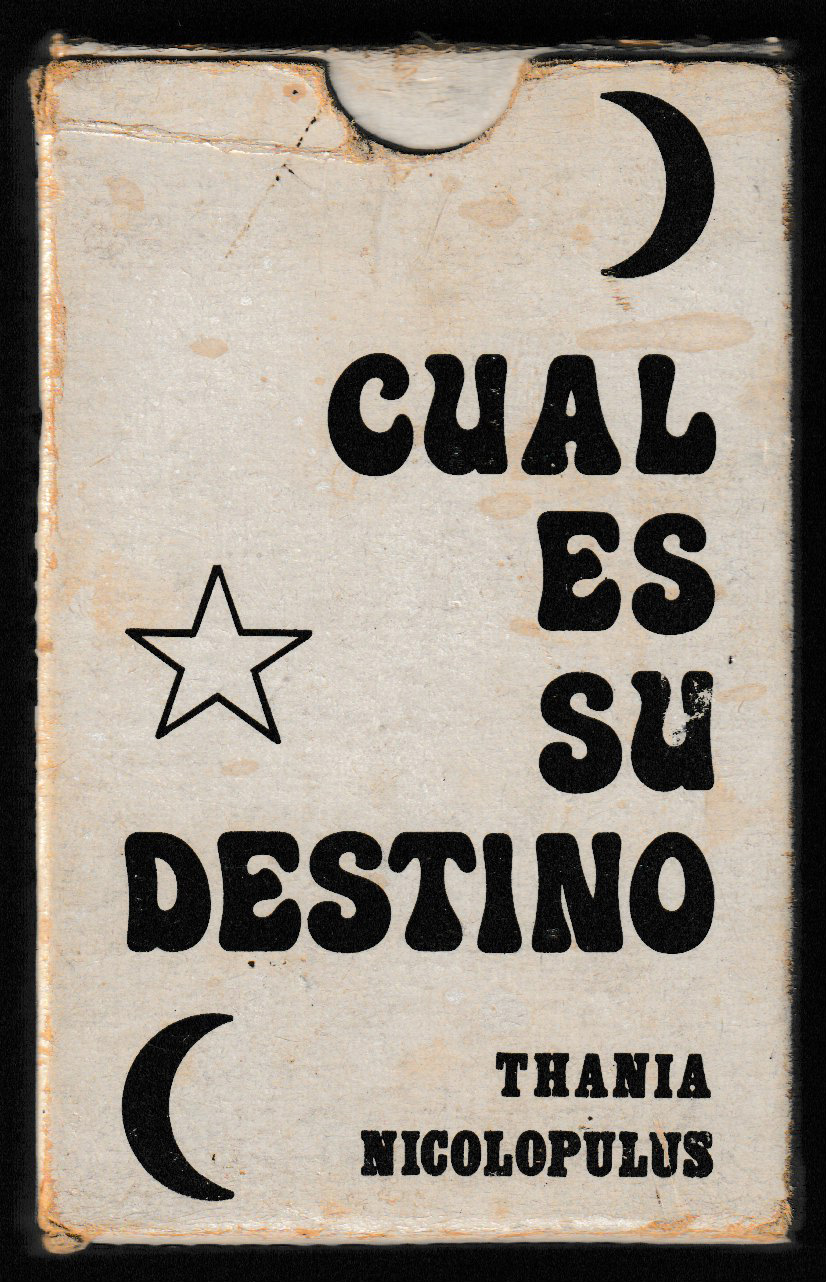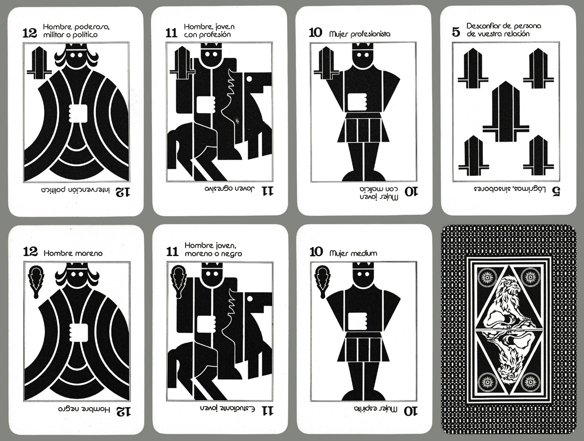 This unusual Spanish-suited fortune-telling pack from Mexico is printed in black and white only. The court card designs (which are the same in each suit) are flat and semi-abstract, having been reduced to their basic elements. The meanings are given at each end in Spanish although, in the case of several cards in the Coins suit, it is impossible to work out which way is upright and which is reversed. The name of the creator is given on the box as Thania Nicolopulus. This could in fact be Thania Nicolopulos, a writer and poet born in Brazil in 1924 who soon after moved to Mexico. The pack is accompanied by a one-page leaflet of instructions in Spanish►