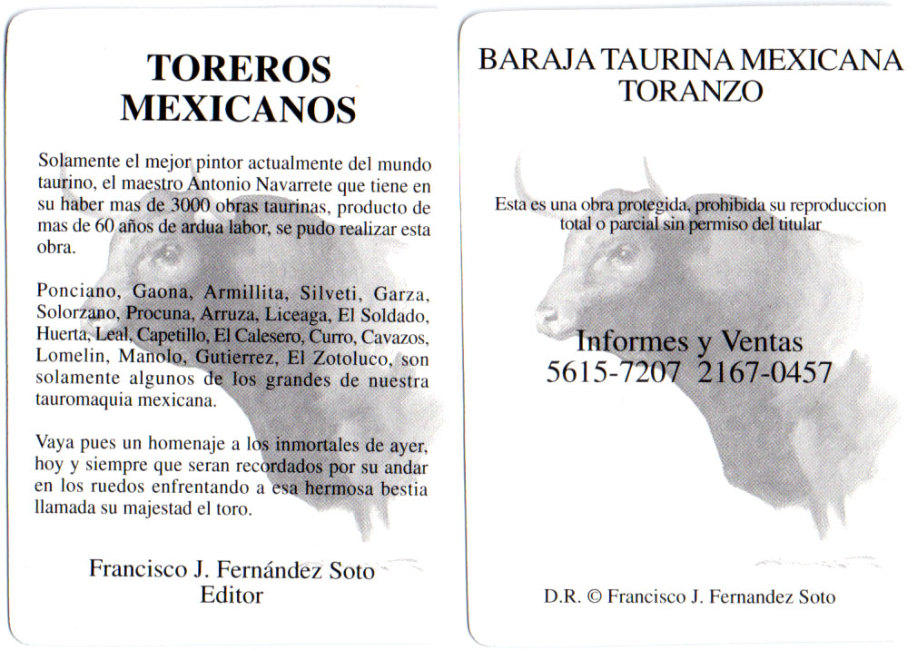 “Baraja Taurina Mexicana Toranzo” published by Francisco Javier Fernández y Soto, 2003, featuring original paintings by Antonio Navarrete (1925-2004). See the Information Cards►