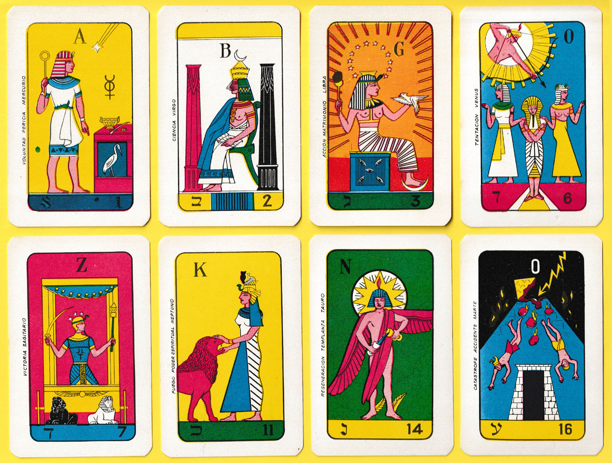 Curious Tarot with Egyptian-style trumps issued by Franco Mora Ruiz from Mexico.