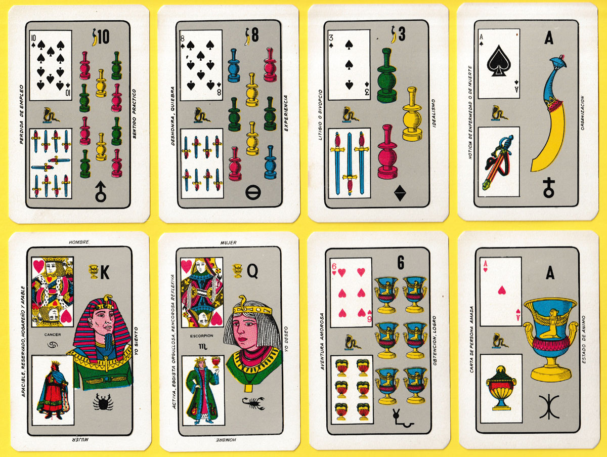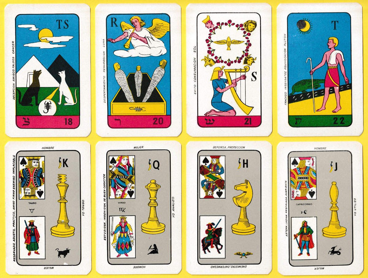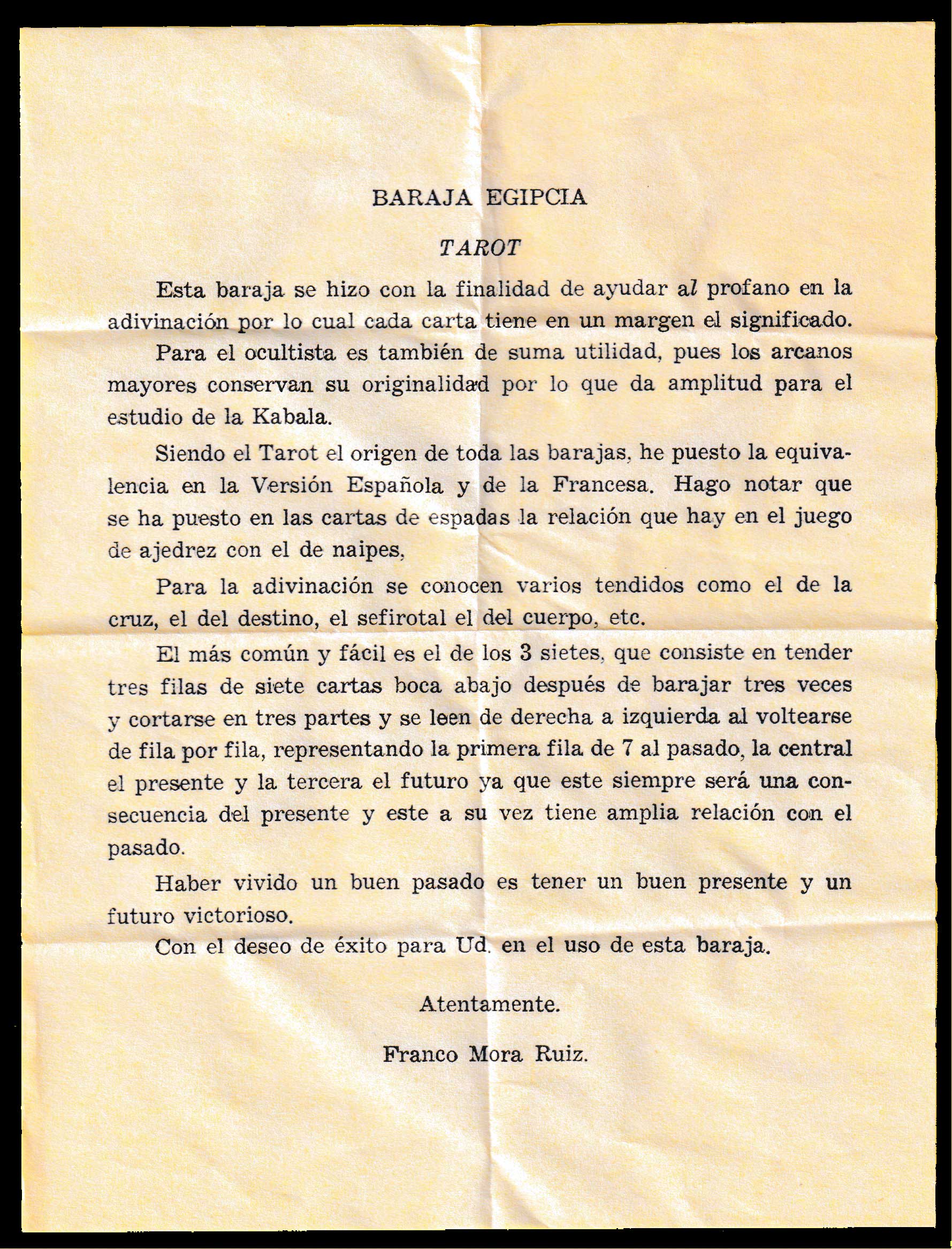 It's curious that the stamp on the box seems to mix Spanish and English ("HECHO EN MEXICO BY ...."). Closer inspection shows that many other foreign elements are mixed together in the pack. For instance, the leaflet authored by Franco Mora Ruiz explains that to aid the beginner suggested interpretations are printed around the sides of the cards. But for the more advanced or proficient occultist there is also a wide range of kabbalistic and other equivalences including chess pieces, zodiac signs, English and Spanish-suited cards, Hebrew letters, etc. interspersed within the designs in order to create more layers of meaning. The author notes that "the Major Arcana retain their originality, providing ample scope for the study of the Kabbalah" presumably so that this creative fusion of symbolic systems enriches the tarot experience. After describing a number of ways to spread the cards, the author concludes by saying "Having lived a good past is having a good present and a victorious future" and wishes success in using the pack. The pack is a good example of a resurgence of Egyptian-themed tarot decks in the 1970s which mixed esoteric and occult symbols with alternative spiritualities and which coincided with the rise of the New Age movement. The so-called 'Egyptian tarot' derives from the earlier 18th century writings of Eliphas Levi, Court de Gébelin and others, which in the 1970s saw a revival of interest and commercial output.
