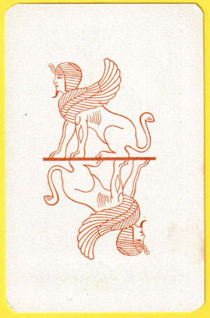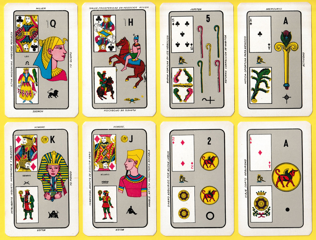 Several cultures and influences have been combined in this curious Tarot pack from Mexico which carries the name of Franco Mora Ruiz on the leaflet. The trump cards betray Egyptian influence but also have letters from the English and Hebrew alphabets and suggested meanings in Spanish down one side. They do not have traditional titles. The minor cards have miniature English and Italo-Spanish cards, Zodiac signs, Egyptian elements, chess pieces, etc., with suggested meanings on up to four sides. Knights for the English cards and queens for the Italo-Spanish cards have had to be invented and do not really match the other courts. These minor cards all have grey backgrounds, while the trumps are more colourful. An image of a sphinx can be found on the reverse (double-ended), on the wrapper and on the box. Stamped on the box are the words “HECHO EN MEXICO BY GRAN MAGO “FATY” • See the box