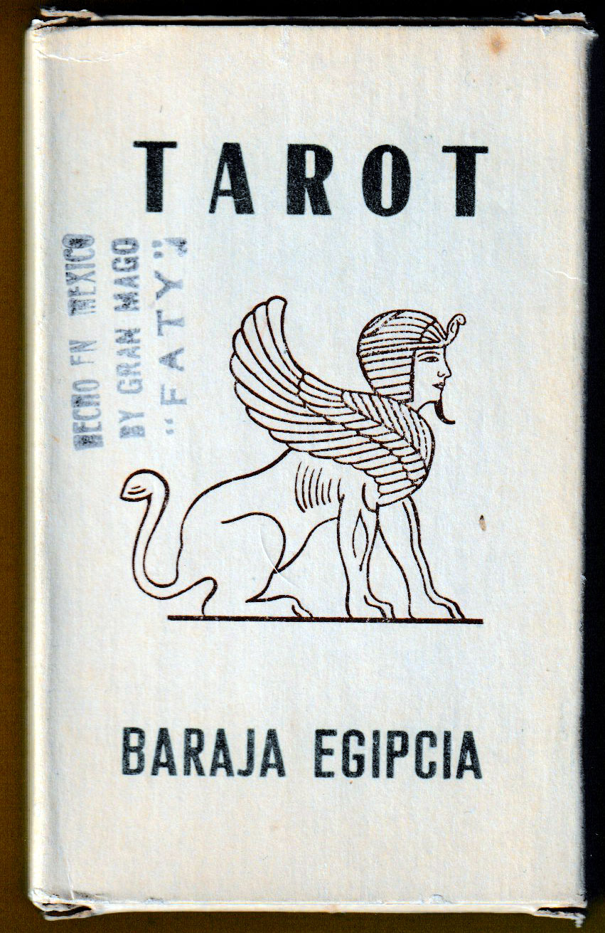 Above: Tarot Baraja Egipcia published by Franco Mora Ruiz, Mexico, c1975. Made in Mexico by Gran Mago “Faty”. 78 cards + 2 blank cards + leaflet in Spanish, in wrapper + tuck box. Size: 62 x 96 mm.