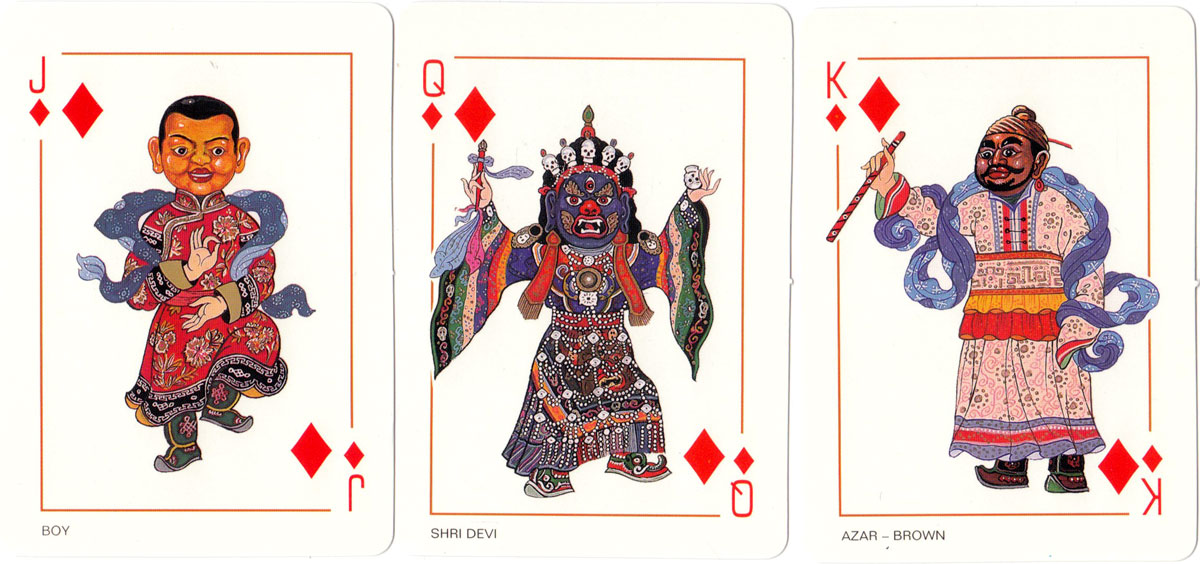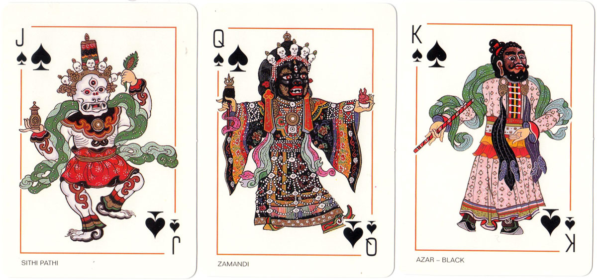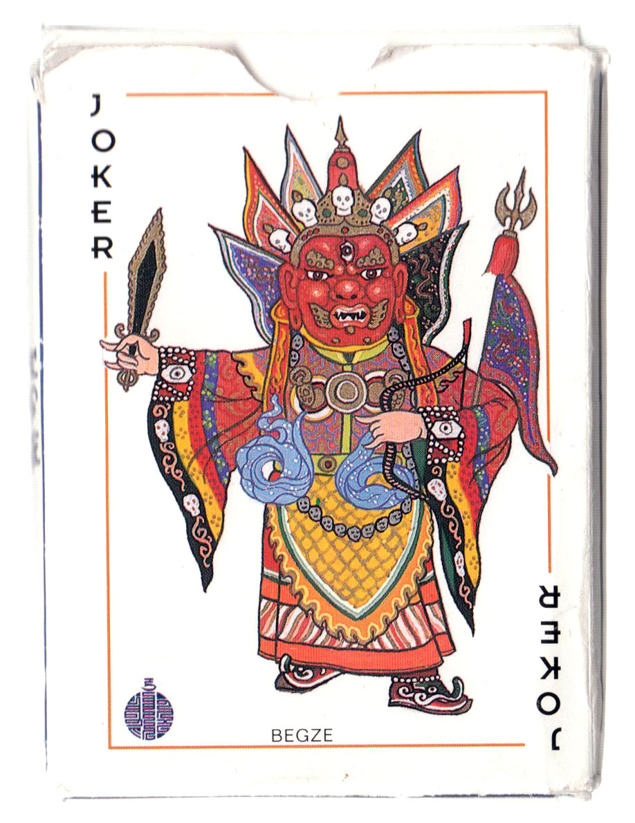 Mongolian Religious Mask Dancing playing cards, c.2010, printed by Tul Co Ltd of Ulaanbaatar Mongolia but published by Sherson Publishing House Pte Ltd of Singapore. The art of Mongolian Mask Dancing is called "Tsam" and is one of the significant religious rituals reflecting buddhist teaching. It is a theatrical art performed by skilled dancers bearing the external appearance and characters of different apostles and devils, animals or real people whose names can be read at the bottom of each card. See the Box►
