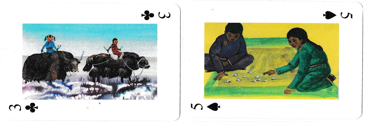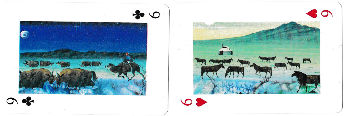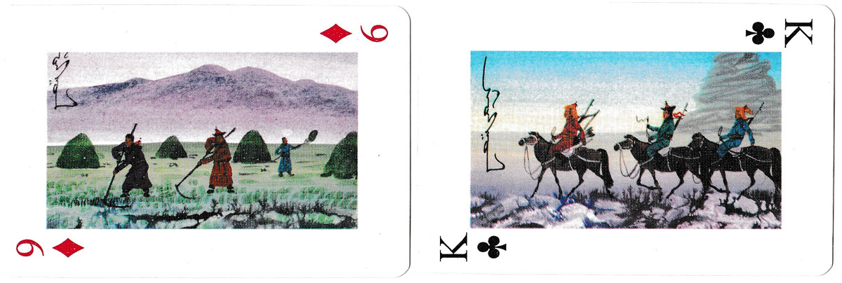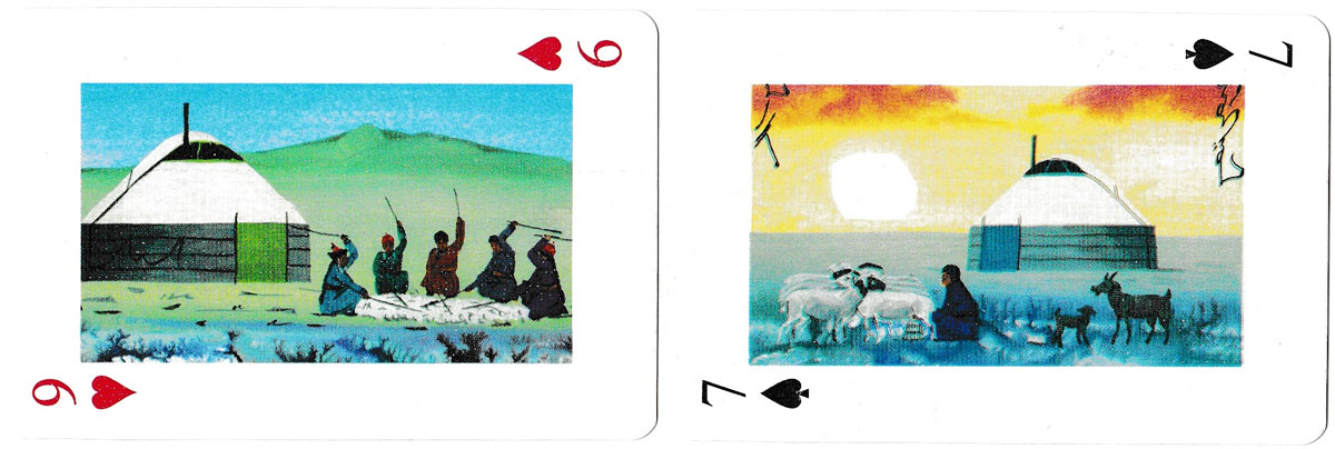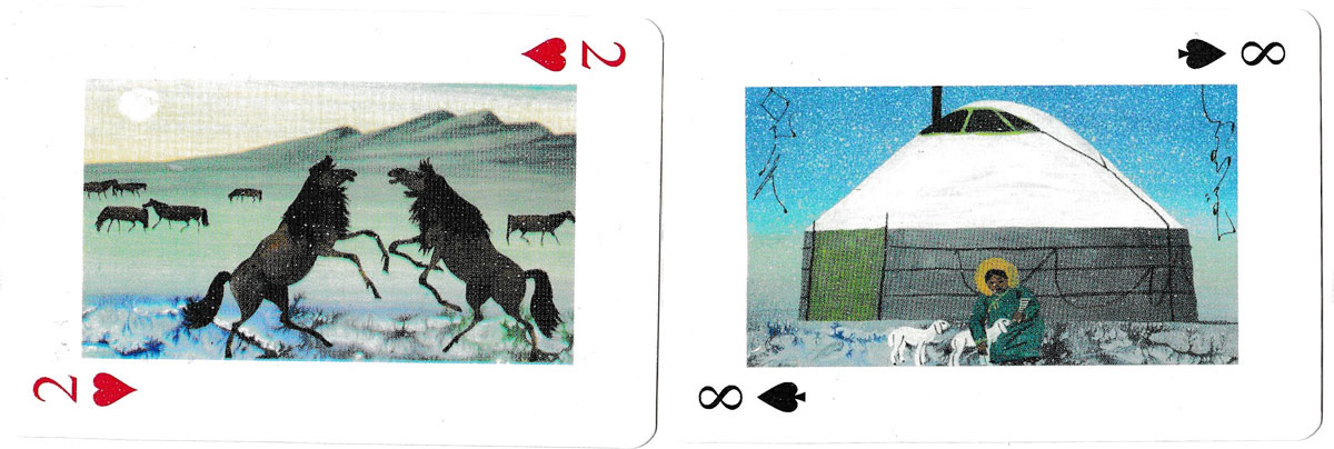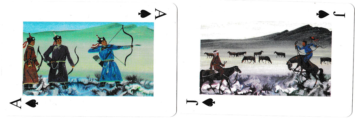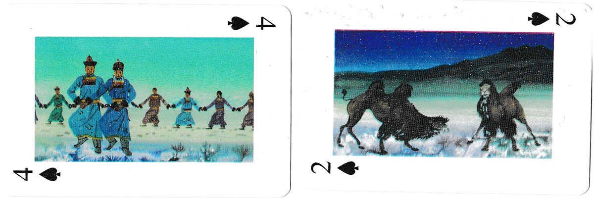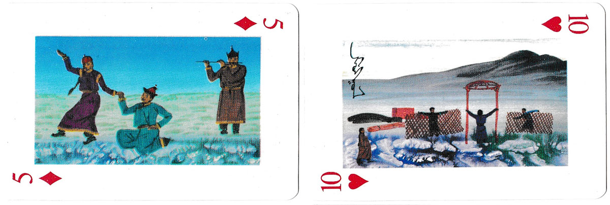 Above: playing cards depicting paintings of Traditional Nomadic Life of Mongolia. 52 cards + 2 jokers, unknown publisher, undated.