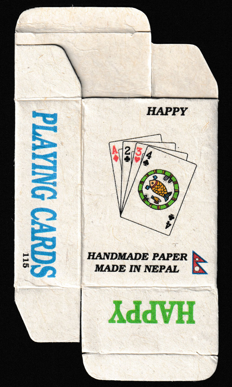 Above: Happy Playing Cards on handmade paper from Nepal. 52 cards + 3 Jokers in tuck box. Size 61 x 85 mm. Publisher and date unknown.