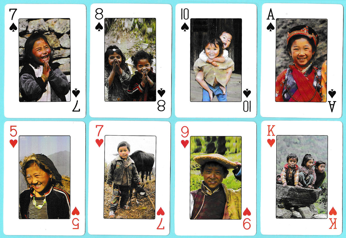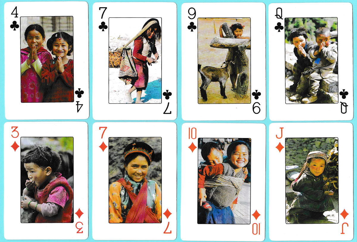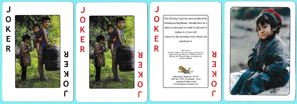This undated pack (52 cards plus 2 jokers and an information card detailing publisher and photo credits) displays the faces of Nepali children, both as they work and at play. Most of the photos portray smiling and happy faces, but others reveal the reality of their daily hardships. It was produced by Himalayan MapHouse, Kathmandu. See the box►