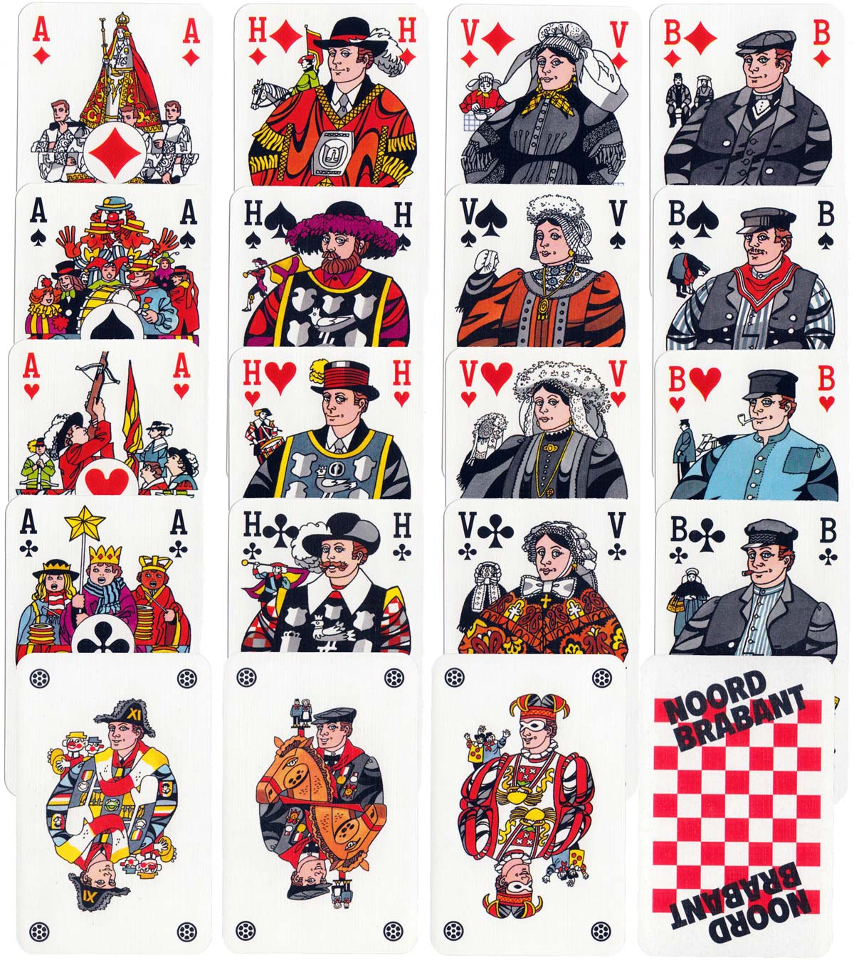 Above: “Noord Brabant” deck designed by Han Janssen and printed by Carta Mundi in 1992 for the I.P.C.S. convention in Veldhoven, Netherlands. The courts show farmers, women and guild members in local costumes. The jokers show representatives of the carnival tradition in North Brabant.
