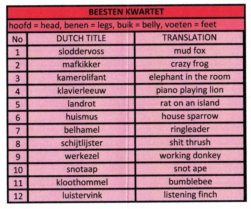Beesten Kwartet designed by Peter Vos. Published by Thomas Rap of Amsterdam, 1995. Here is a Translation Sheet►