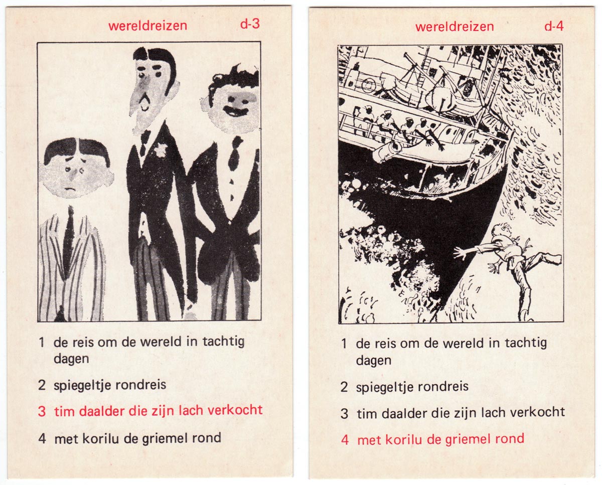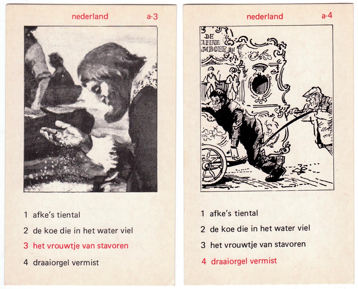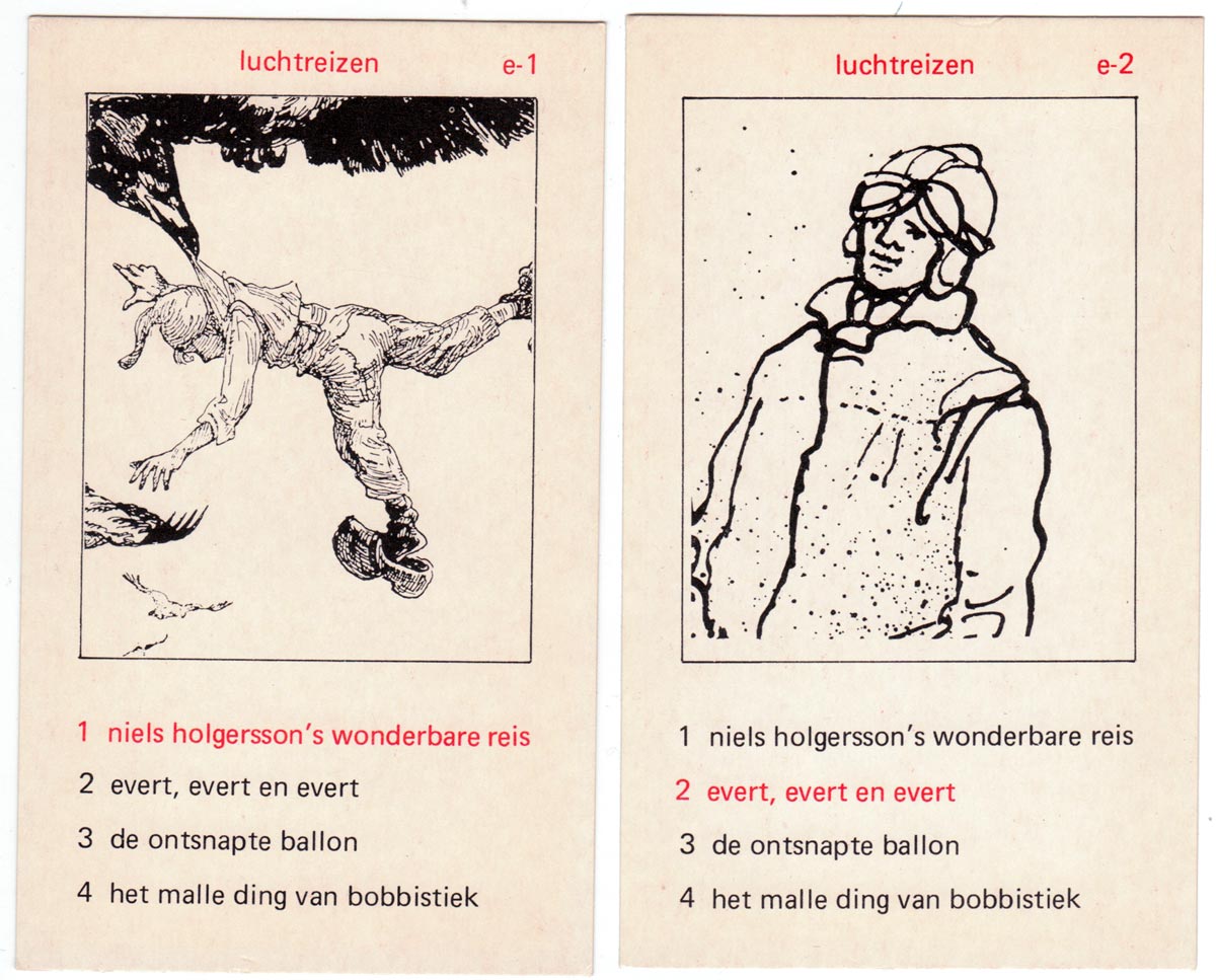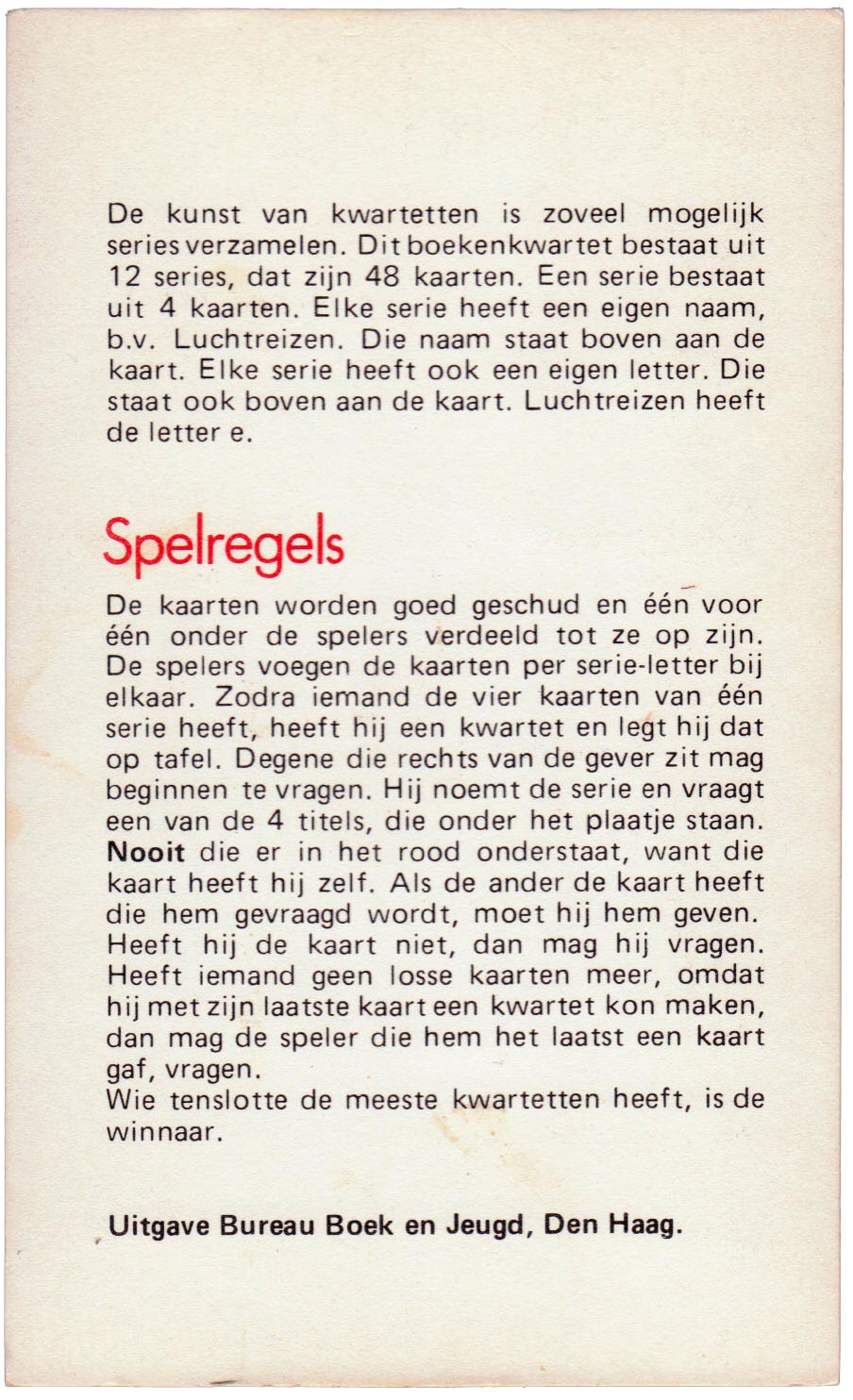 Boekenkwartet features illustrations from children's books. The game consists of 12 series of four cards each, that is 48 cards, with illustrations from the books on each card. Each quartet series has a group name (The Netherlands, Europe, Seas of the World, World Tours, Air Travel, Africa, America, Australia, Asia, Islands, Fantasy, International) and a letter in red at the top of the card, whilst the four book titles in each series are listed at the bottom. The aim is to collect as many complete series as possible. See the Rules►