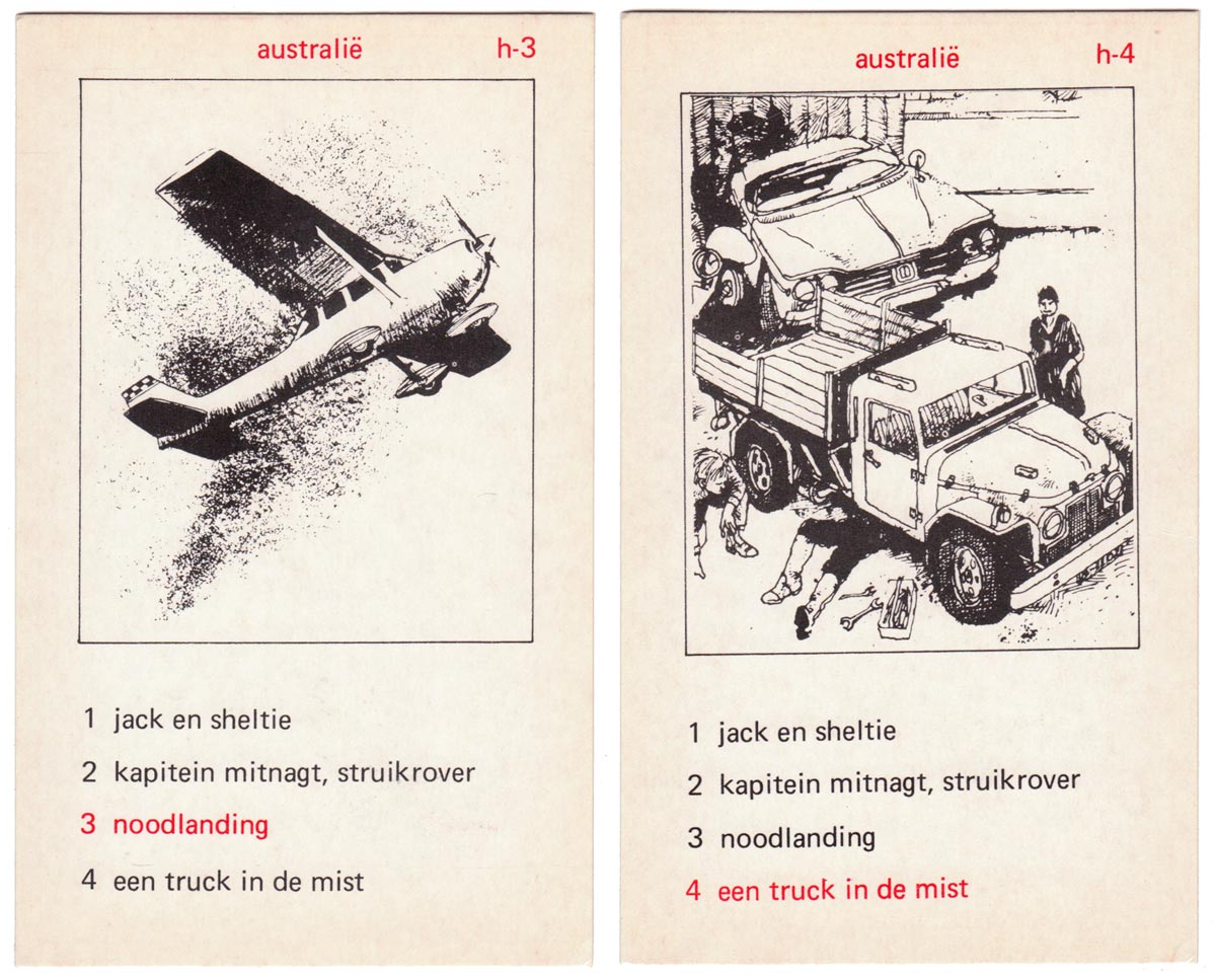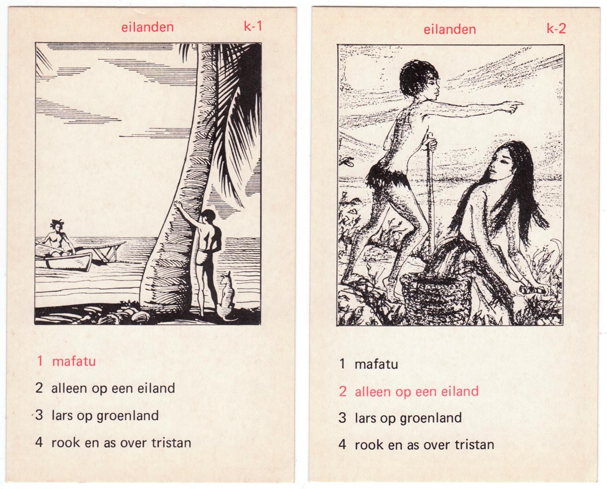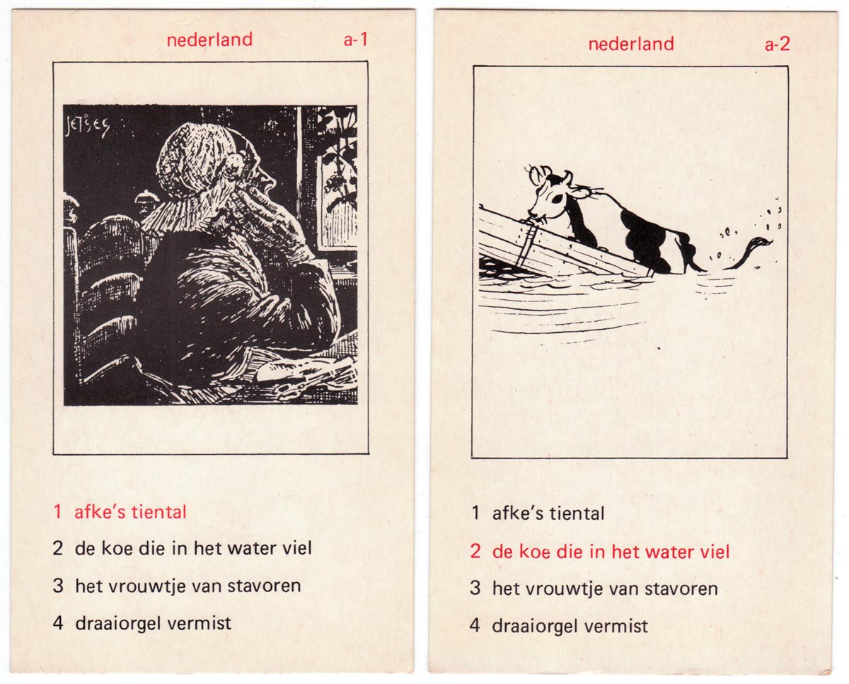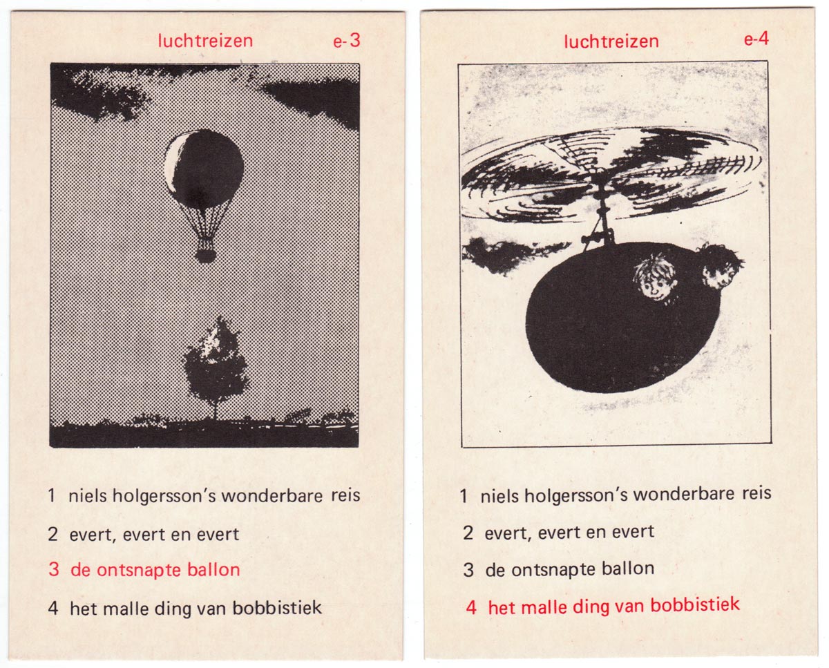 Boekenkwartet features illustrations from children's books. The game consists of 12 series of four cards each, that is 48 cards, with illustrations from the books on each card. Each quartet series has a group name (The Netherlands, Europe, Seas of the World, World Tours, Air Travel, Africa, America, Australia, Asia, Islands, Fantasy, International) and a letter in red at the top of the card, whilst the four book titles in each series are listed at the bottom. The aim is to collect as many complete series as possible. See the Rules►