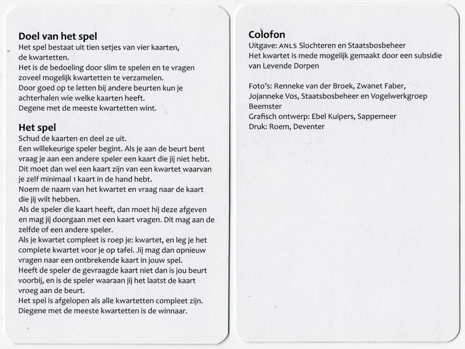 Nature Quartet game designed by Ebel Kuipers, published by ANLS Slochteren & Staatsbosbeheer, printed by Roem Speelkaarten, Kampen.