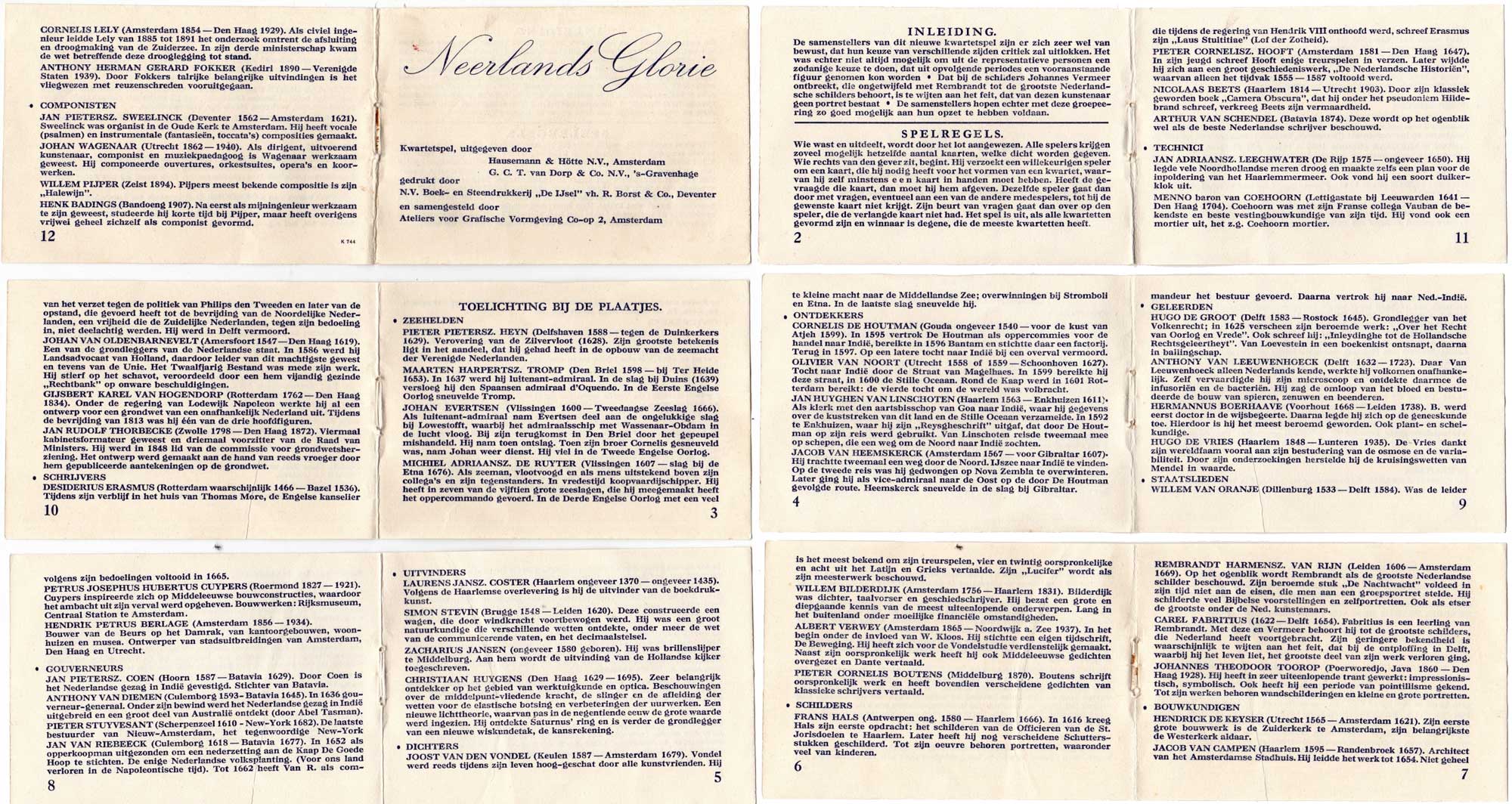 Neerlands Glorie Kwartetspel published by Hausemann & Hötte N.V, Amsterdam, 1945. The game cards feature quartets of eminent Dutch Inventors, Poets, Painters, Architects, Governors, Scholars, Statesmen, Writers, Technicians, Composers, Naval Heroes and Explorers from different periods.