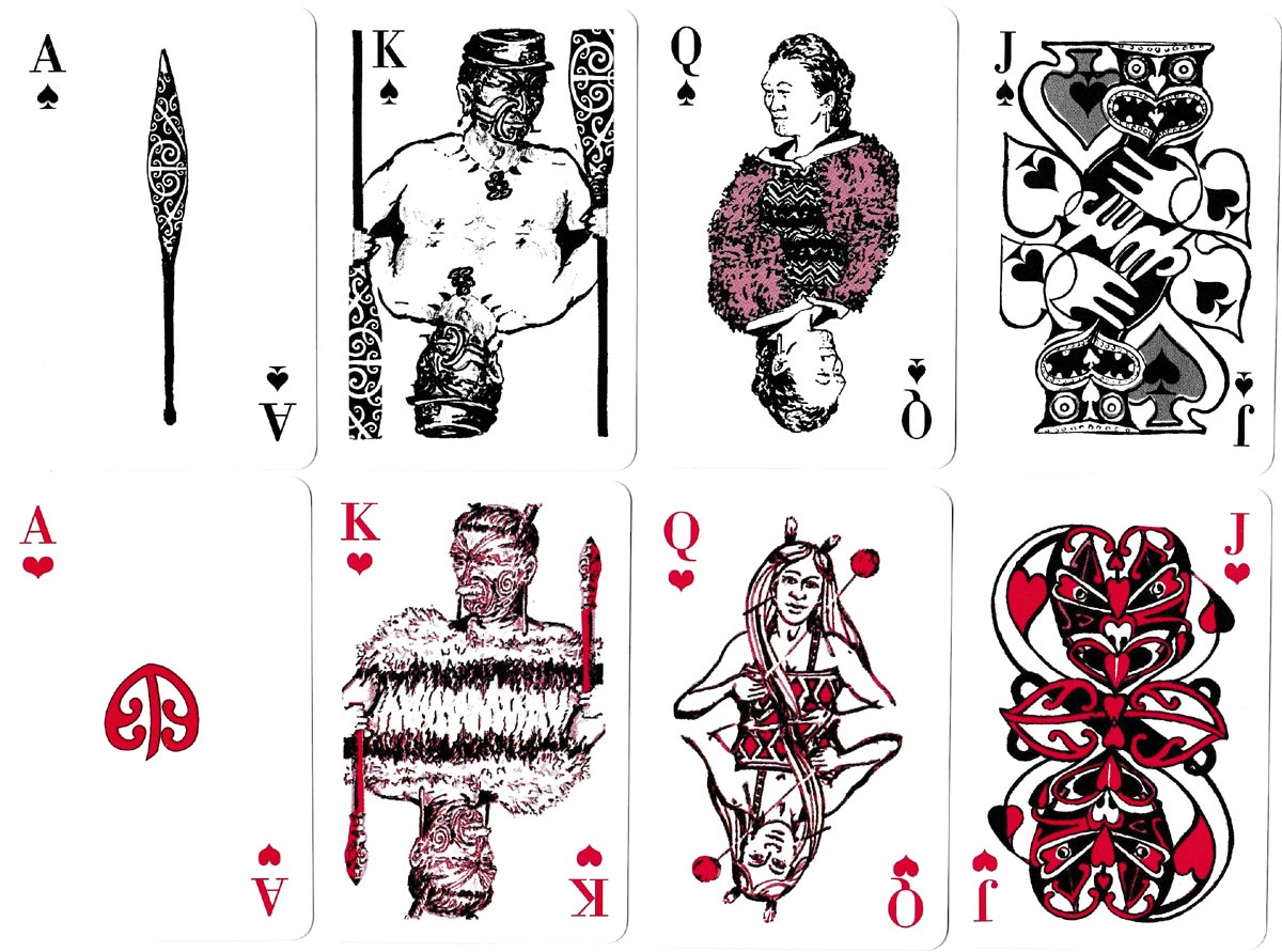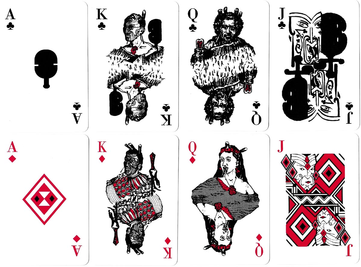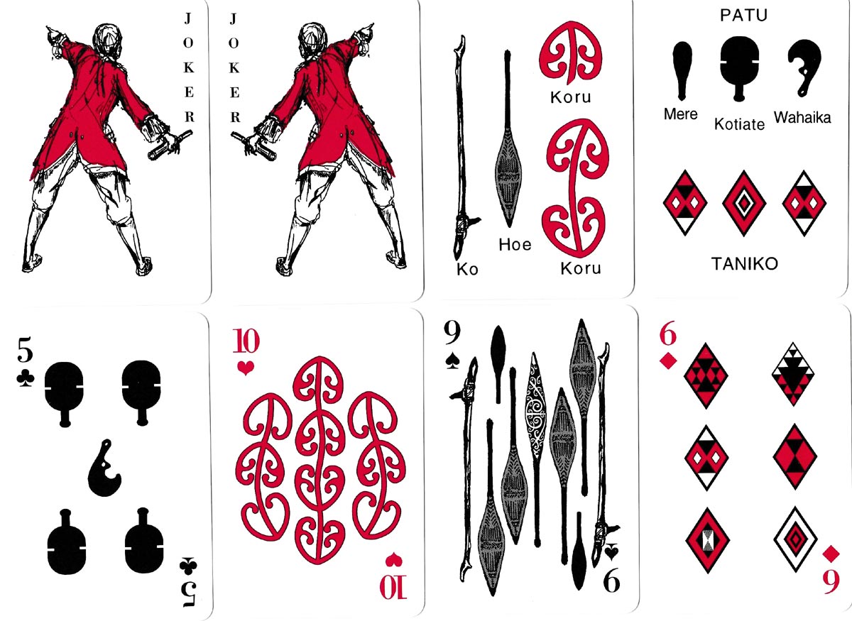 The suits approximate to the standard, but at the same time are intended to replicate elements of Maori art. The clubs resemble the Maori short club or kotiate; the hearts find echo in the rhythmic koru design used by Maori carvers; the spades resemble ornate short paddles; the diamonds replicate weaving patterns. The position of these pips is non-standard.