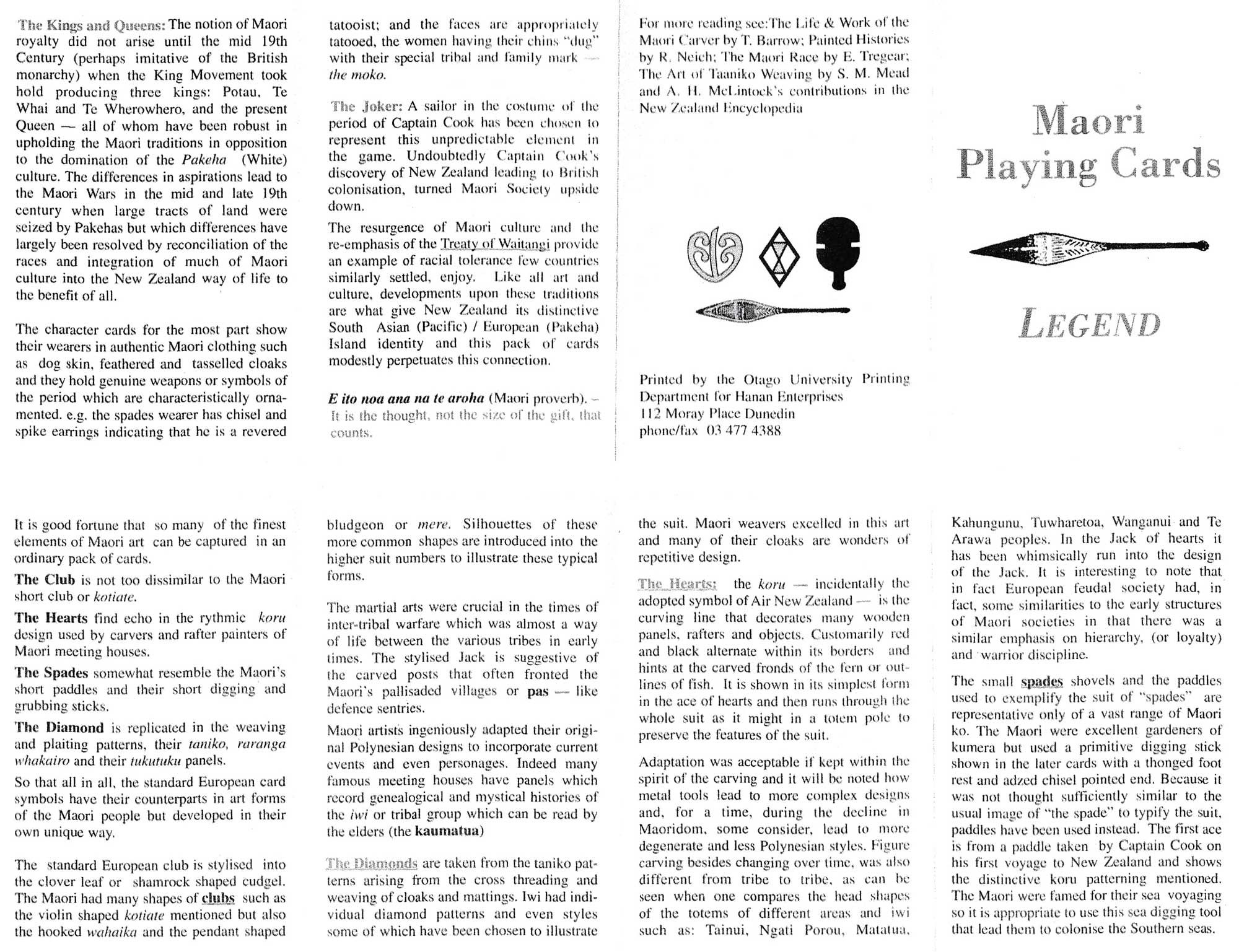 This undated pack was produced by Hanan Enterprises, Dunedin and was printed by Otago University Printery. It consists of 56 cards including 2 jokers and 2 extra cards giving the Maori names of the four suits, and a separate printed legend.