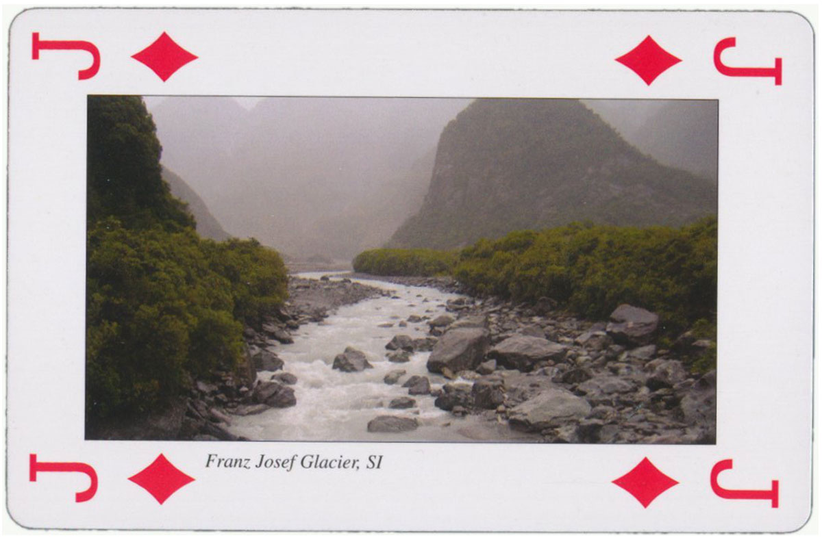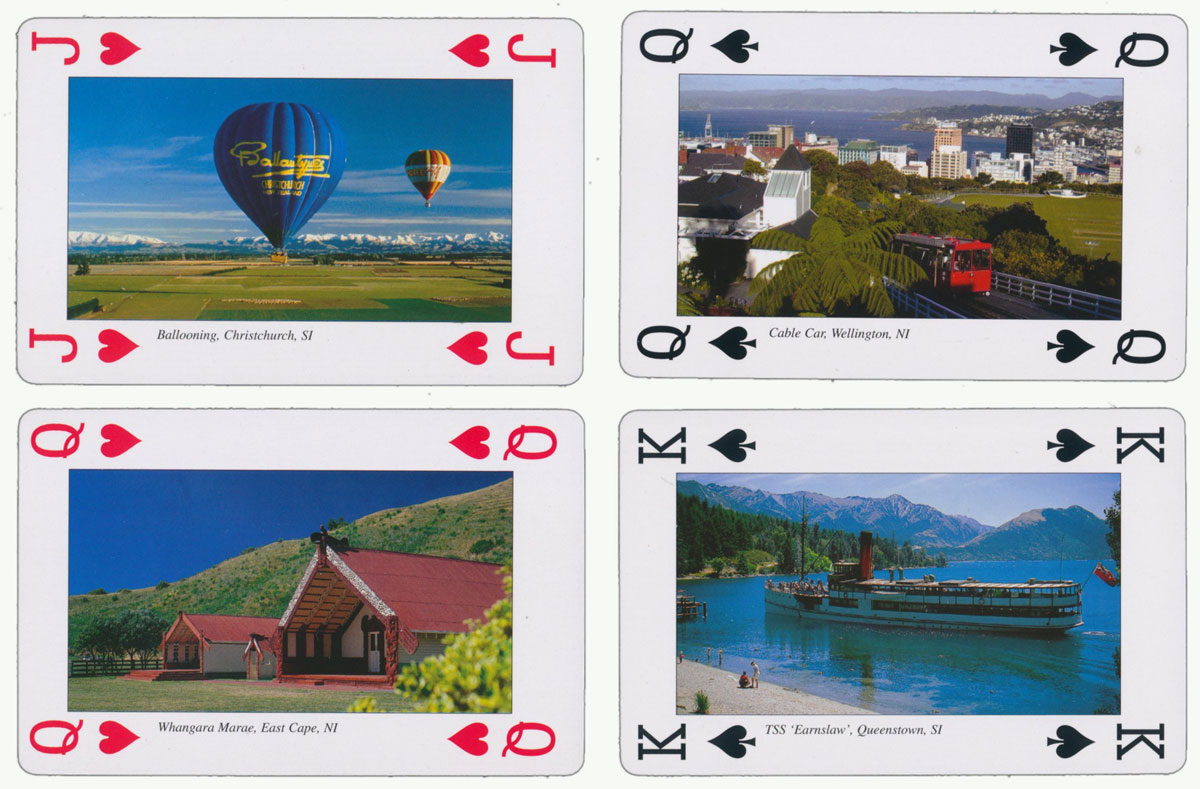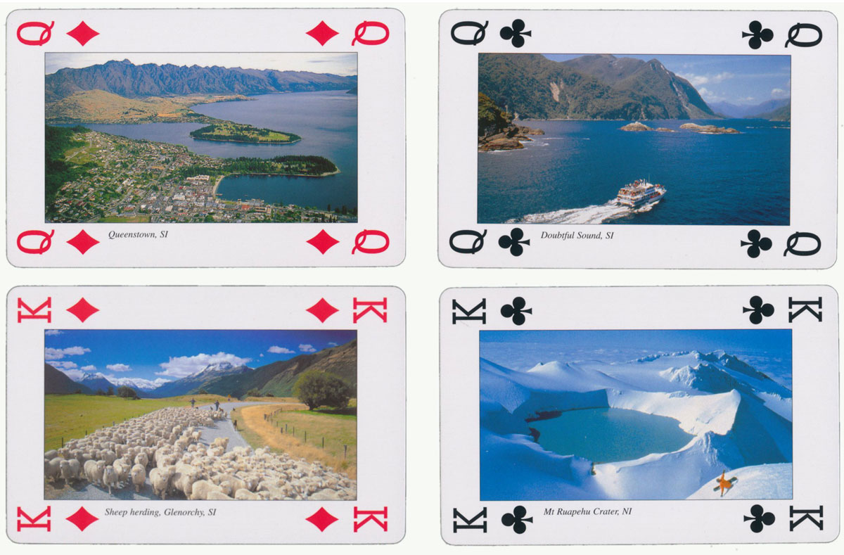 Above: Souvenir of New Zealand playing cards produced by Hema Maps NZ Limited, c.2002. 52 cards + 2 jokers in clear plastic box. Images courtesy Matt Probert.