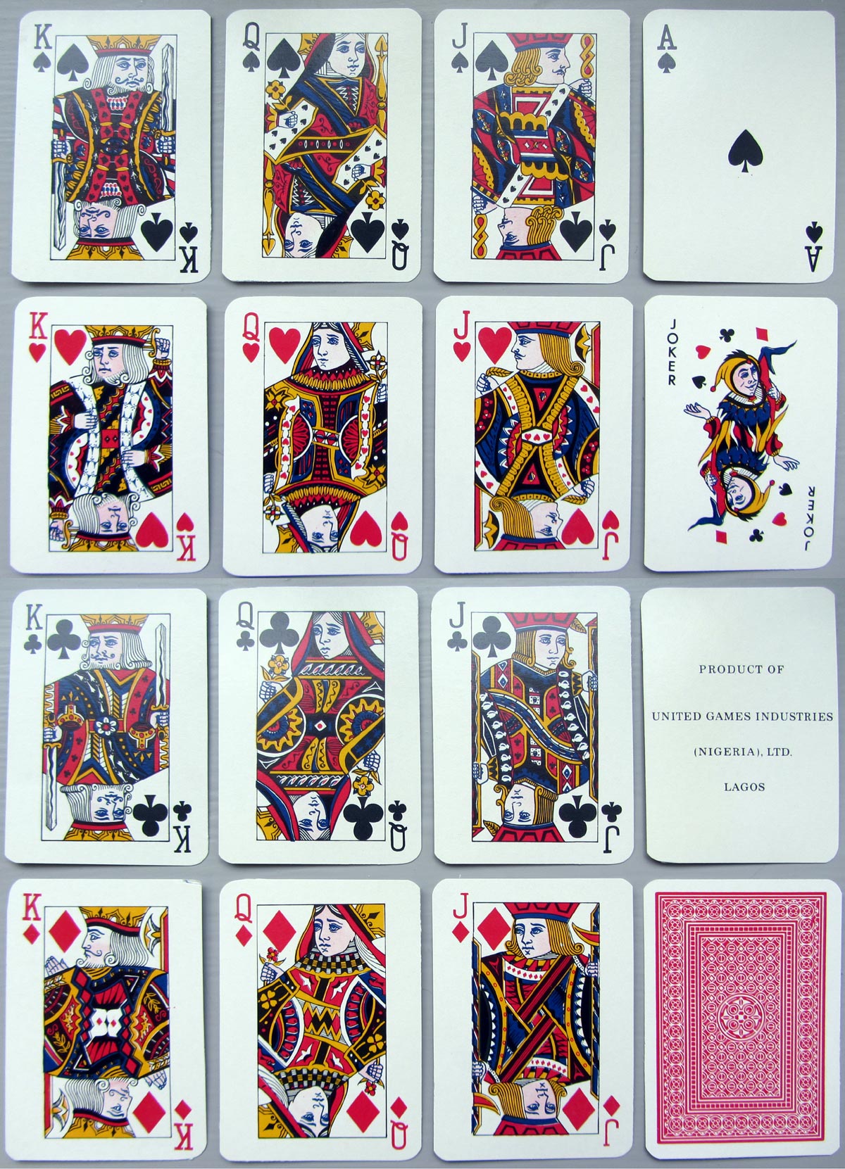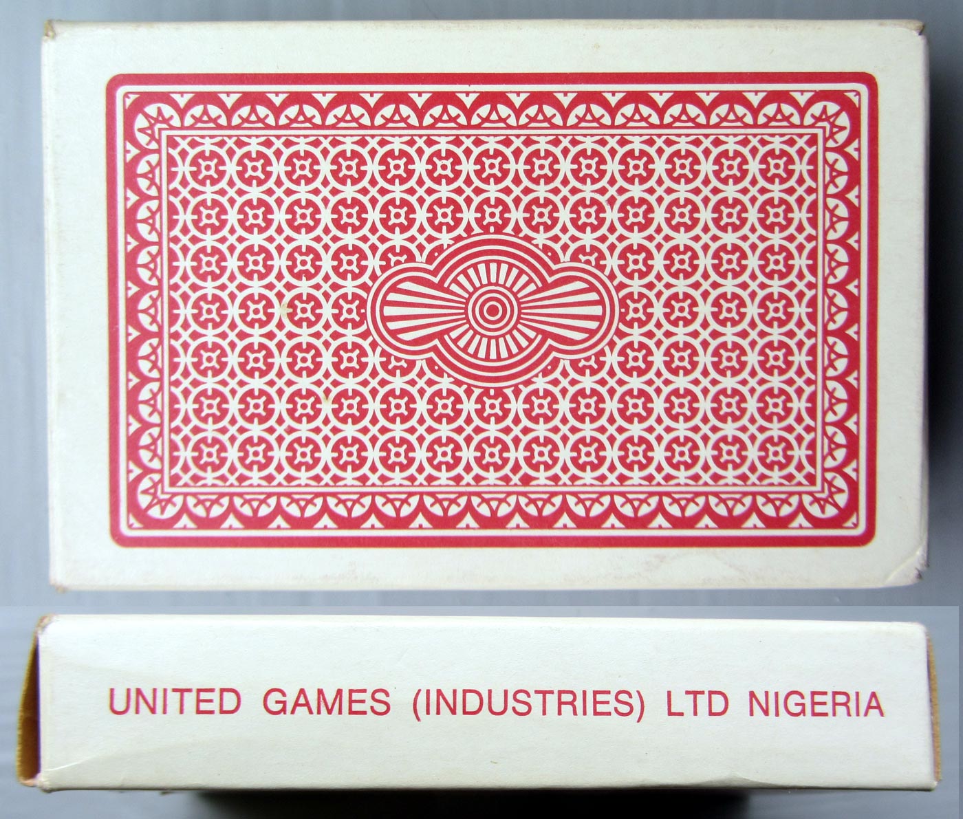 Above: standard English pattern pack from Nigeria made by United Games (Industries) Ltd, Lagos, Nigeria, c.1970. 52 cards + 1 Joker + 1 extra card in tuck box.