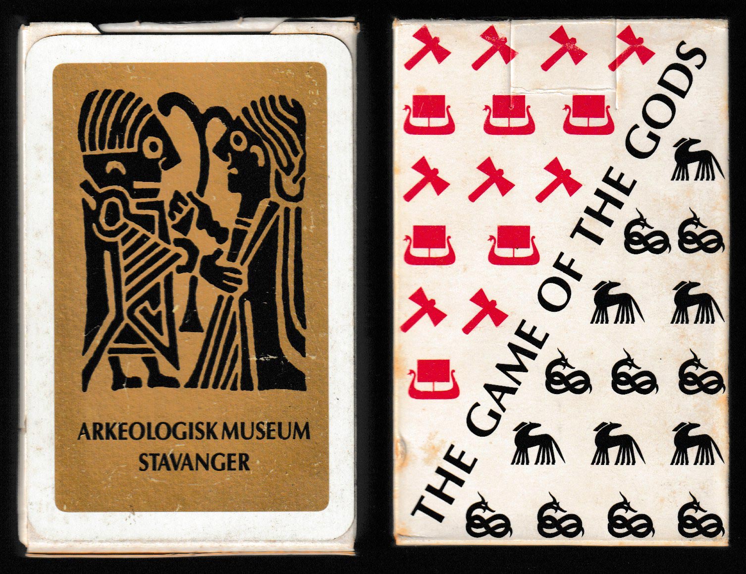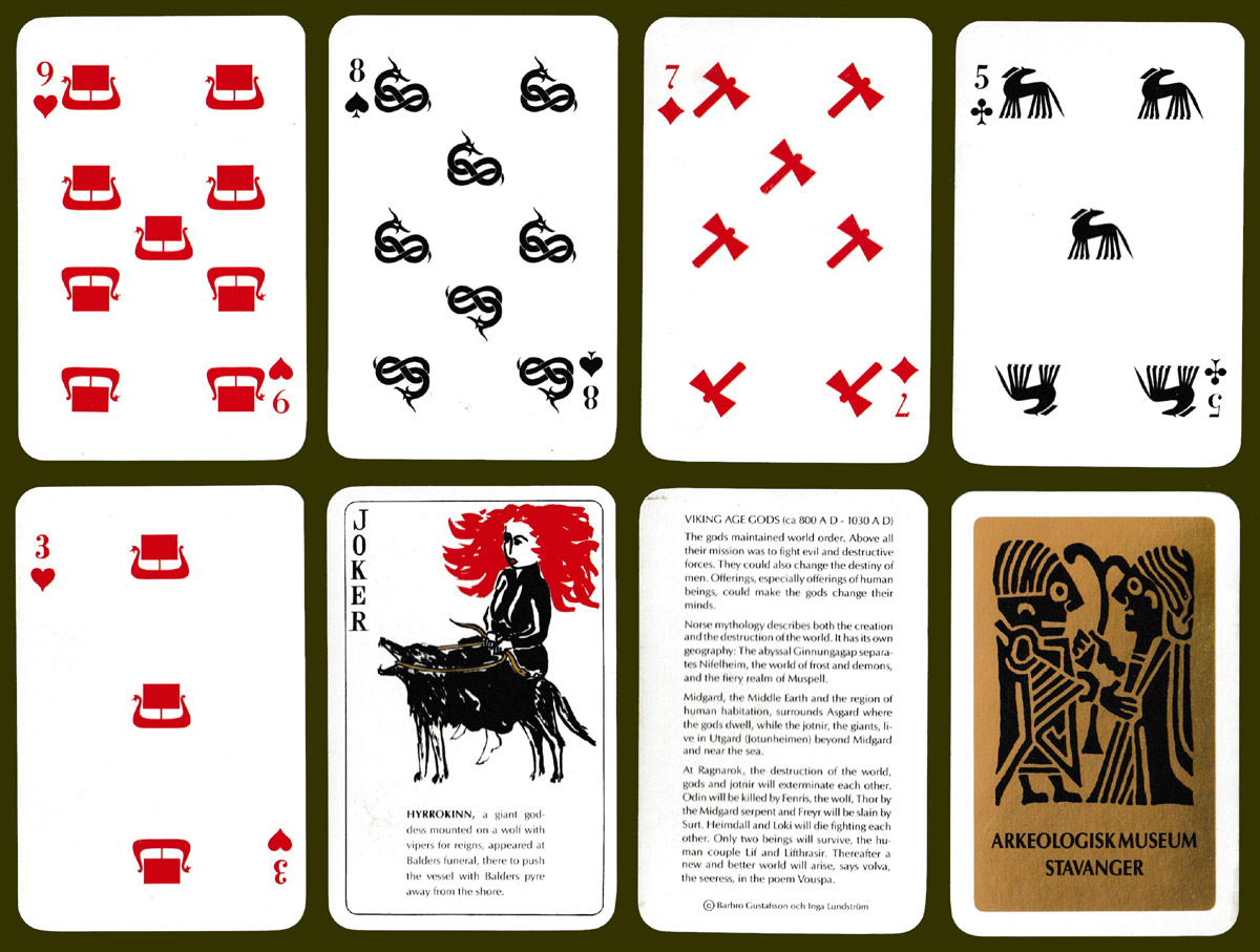 Above: The Game of the Gods playing cards made by Esselte Öbergs AB, Eskilstuna, Sweden, for the Arkeologisk Museum, Stavanger, Norway, 1991. 52 cards + 2 (identical) Jokers + 1 extra card in tuck box. Size: 56 x 86.5 mm. © Barbro Gustafsson and Inga Lundström