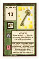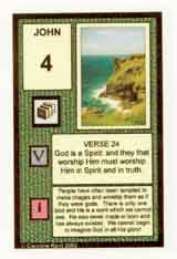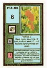 The cards are durable, attractive, instructive and able to be used for a variety of games. Modelled on traditional playing cards, in terms of suits and numbering, opened up the number of possible games considerably. Packs come complete with suggested instructions for playing a number of popular family games, such as Snap, Happy Families, Matching Pairs, all of which which enhance memory skills, problem solving skills, strategy and team playing. At the same time, they promote the Word of God. |