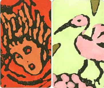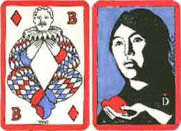 Left: Skat by Me and My Friends. This limited edition playing card deck from 1990 was a co-operative project consisting of 32 cards made by various artists from different countries. The deck was entirely hand made and coloured. | ||