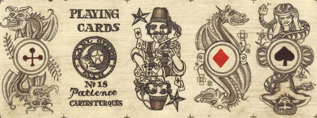 This is a double-ended copy of Dondorf's "Four Corners of the Earth" pack of 1870. The courts show exotically dressed figures from around the world. Each card measures: 75 x 44 mm. |